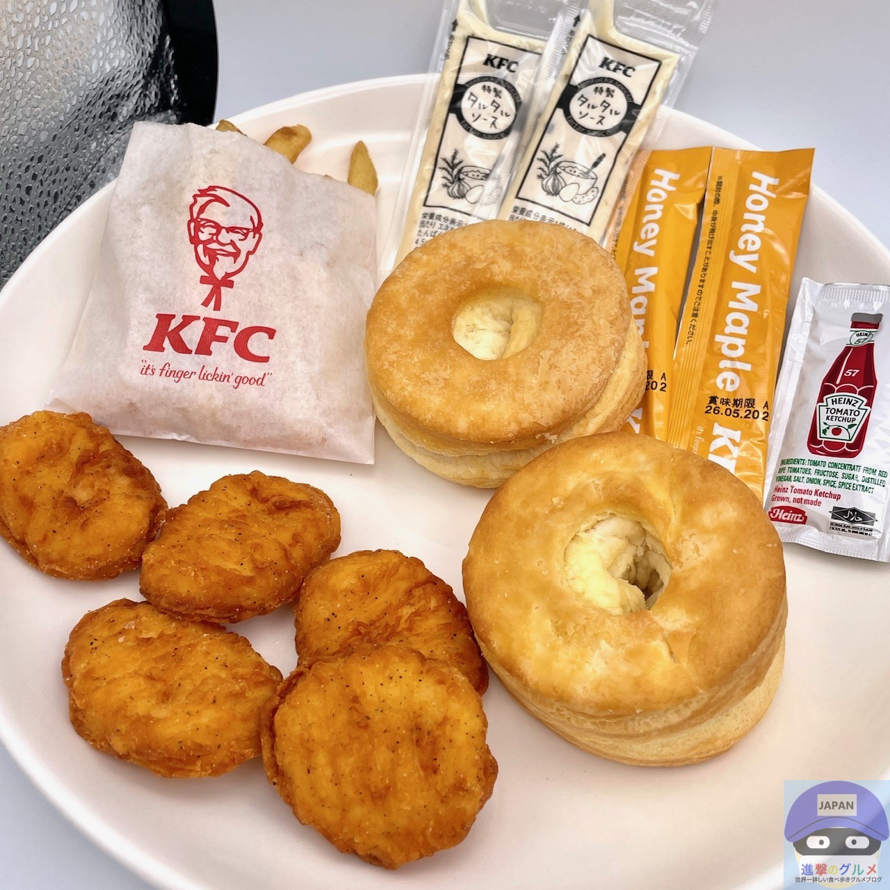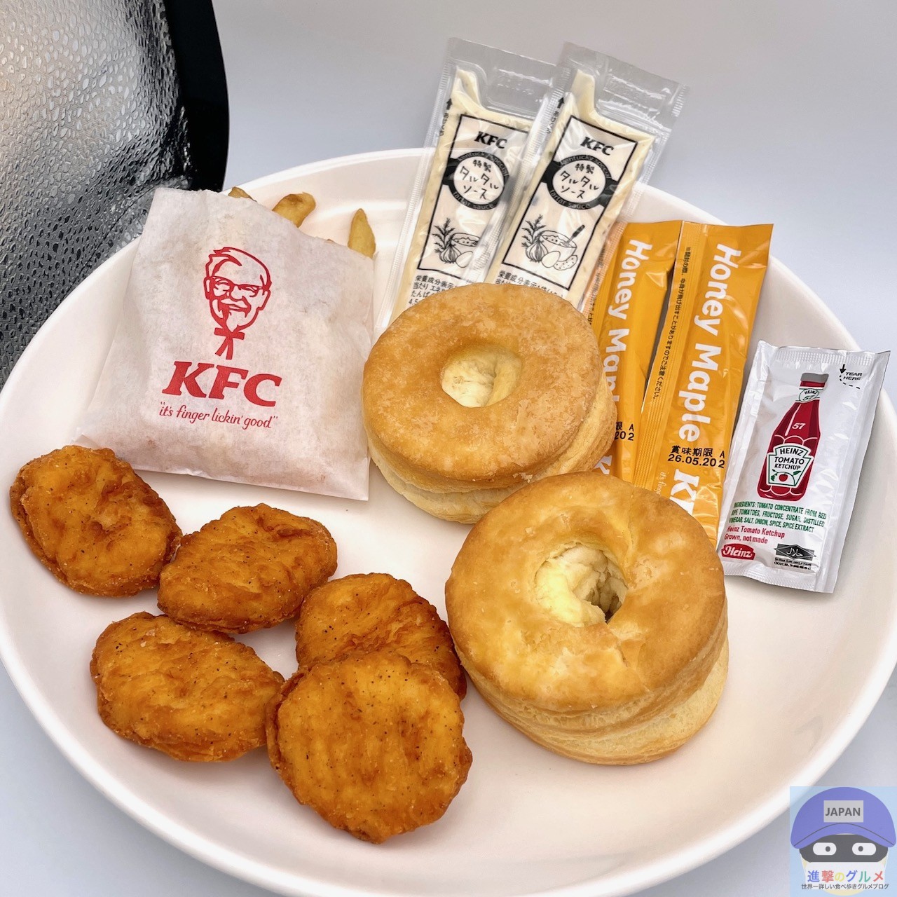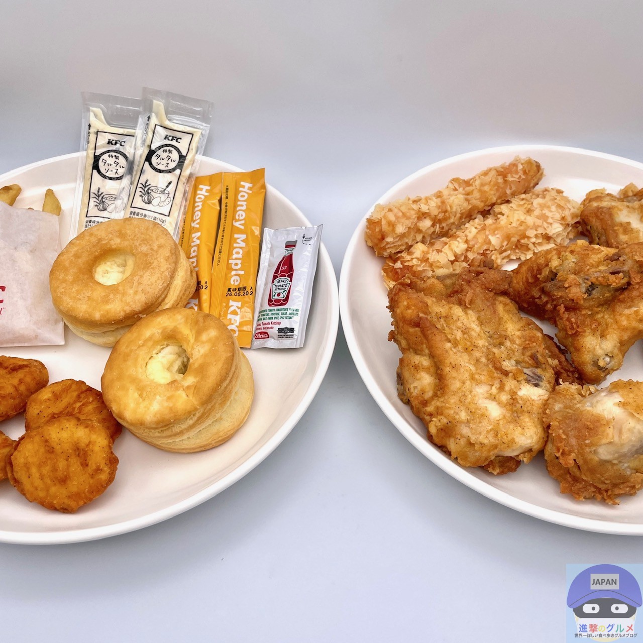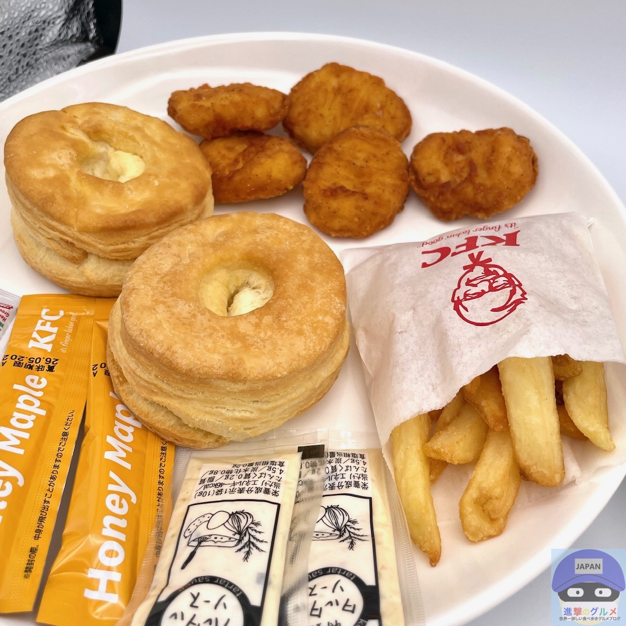 オリジナルチキン5ピース、えびぷりぷりフライ2ピース、ビスケット2個、ナゲット5ピース、ポテト(S)、特製タルタルソース、特製ハニーメイプル、ケチャップです。