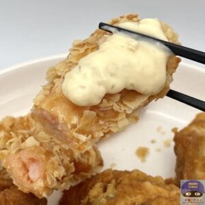 えびぷりぷりフライをカットし、特製タルタルソースをつけて食べます。
