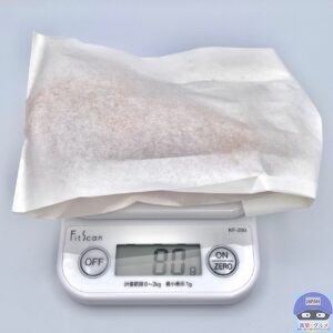 重さをはかると、包装紙を含めて80gでした。