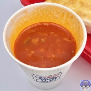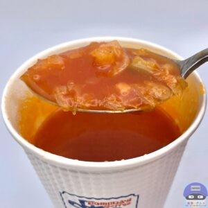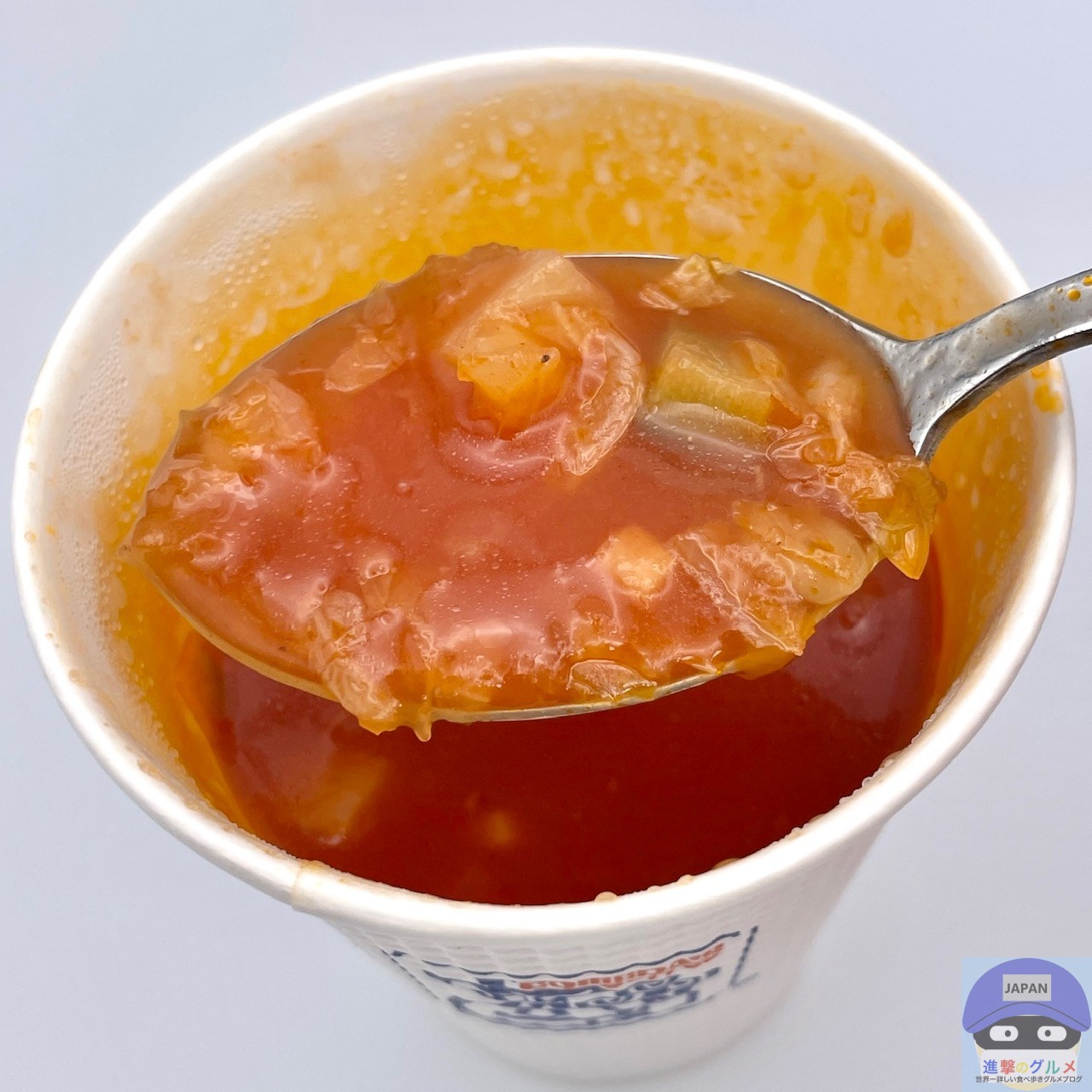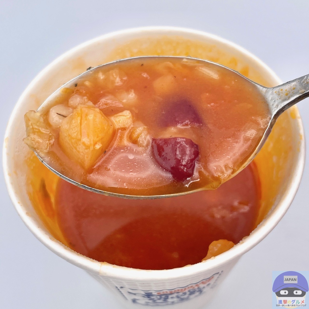 野菜の旨みが溶け込んだ良い香りがして、具材は、トマト・キャベツ・玉ねぎ・じゃがいも・ズッキーニ・赤いんげん豆・もち麦などが入っています。