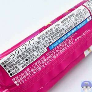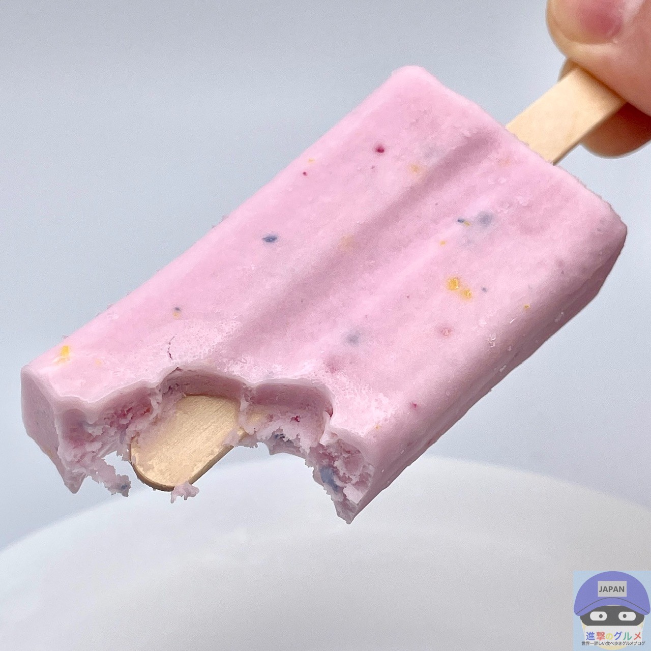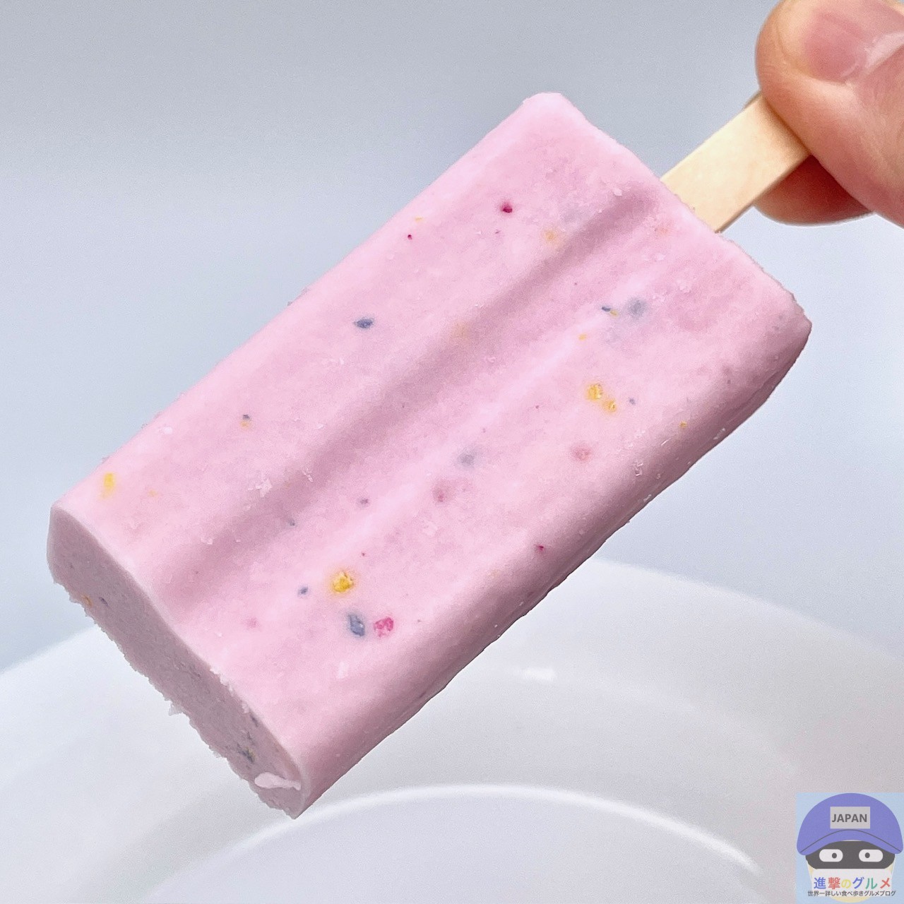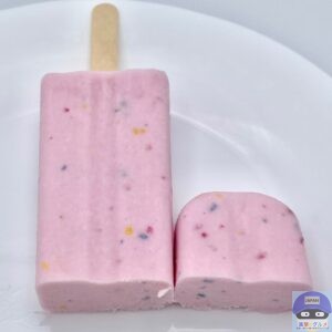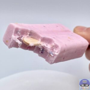 開封すると、ぶどう味のアイスに赤・青・黄のキャンディチップを混ぜ込んだ、「ねるねるねるね」に似た見た目のアイスバーです。