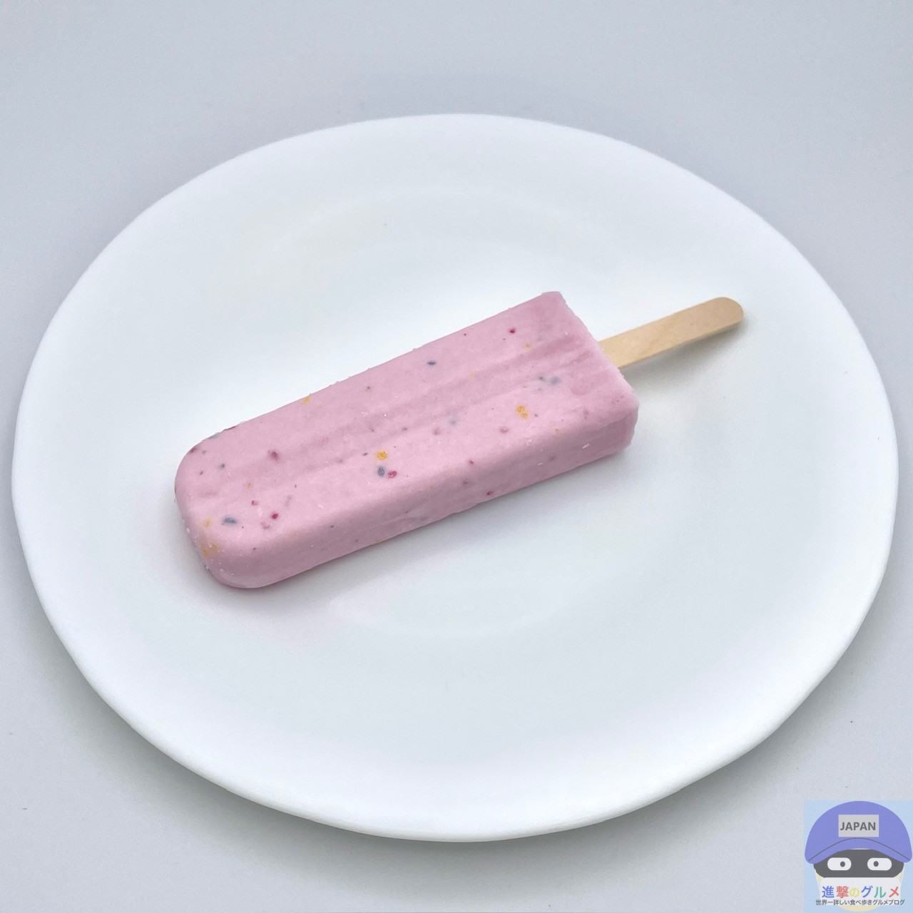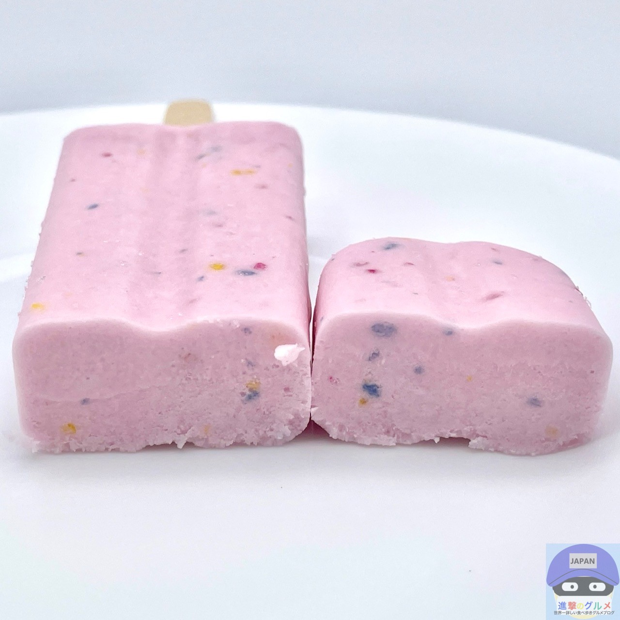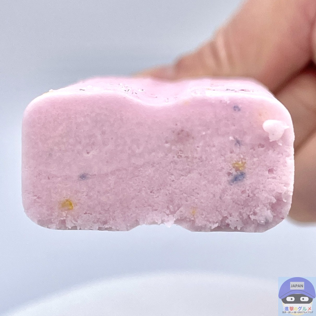 開封すると、ぶどう味のアイスに赤・青・黄のキャンディチップを混ぜ込んだ、「ねるねるねるね」に似た見た目のアイスバーです。