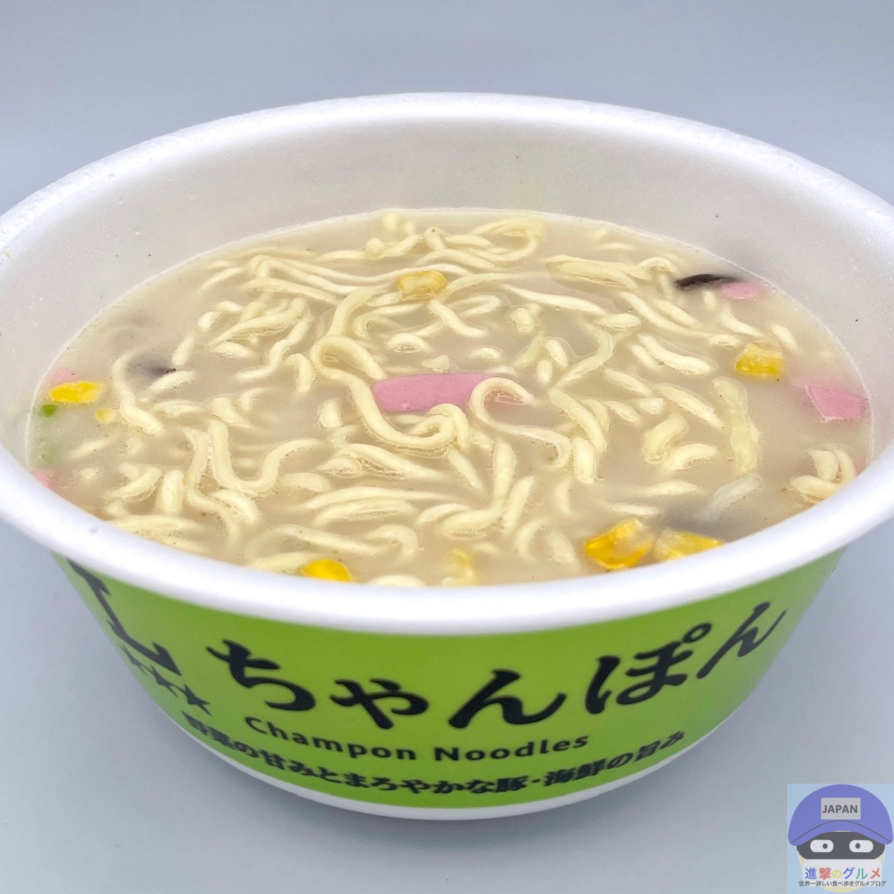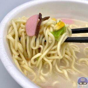 野菜の甘み、豚と海鮮のまろやかな旨みが特長のちゃんぽん、コンビニカップ麺です。