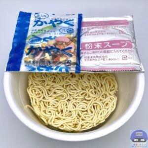 開封すると、油揚げめん、粉末スープ、かやくが入っています。