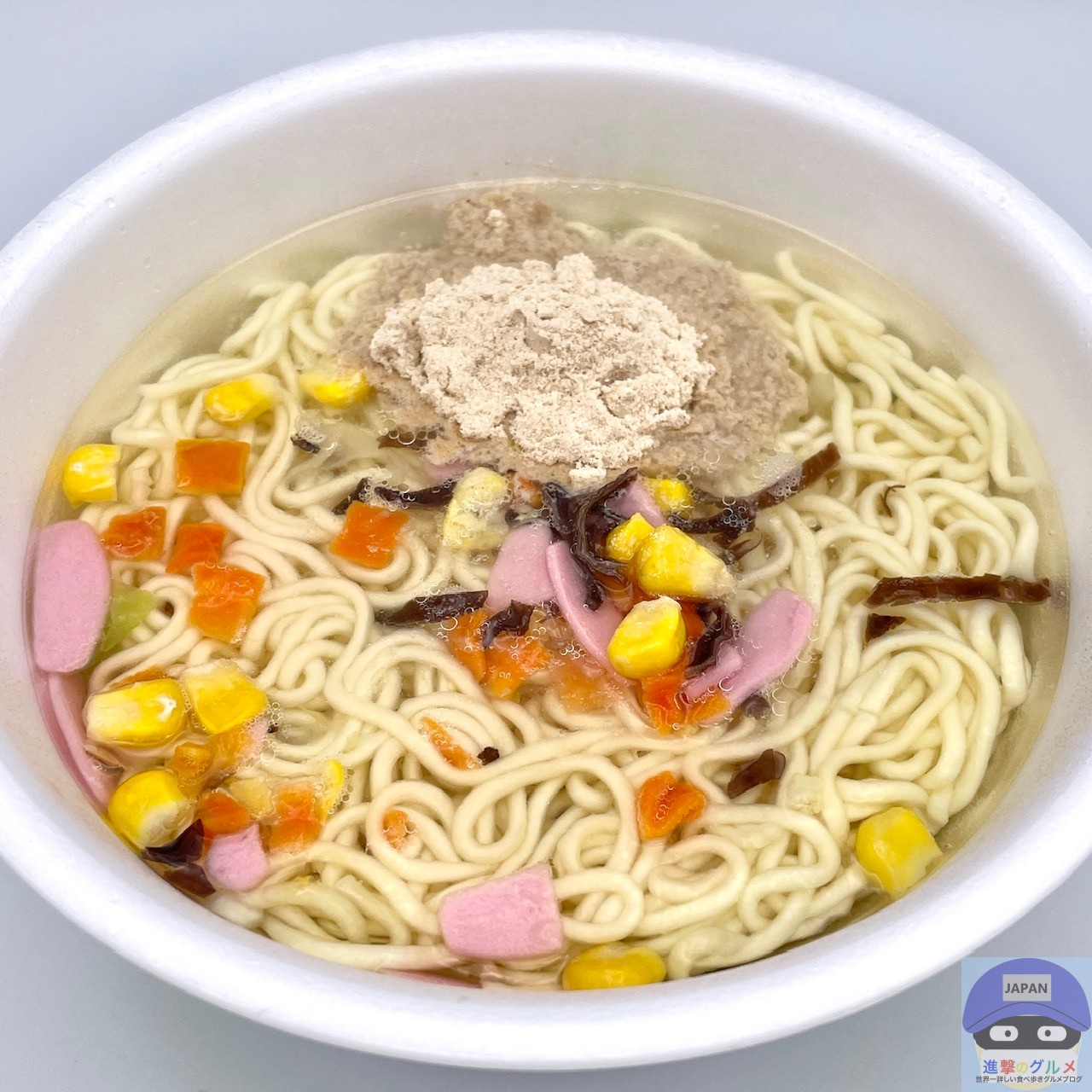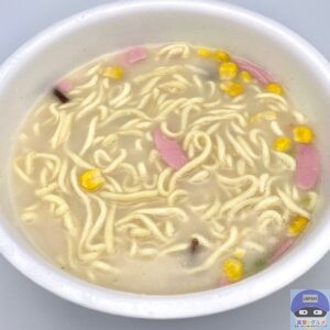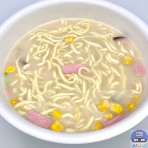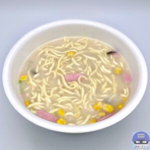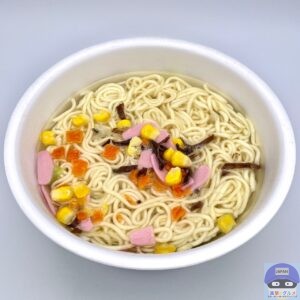 かやく(キャベツ、コーン、かまぼこ、にんじん、きくらげ)を入れてお湯を注ぎます。