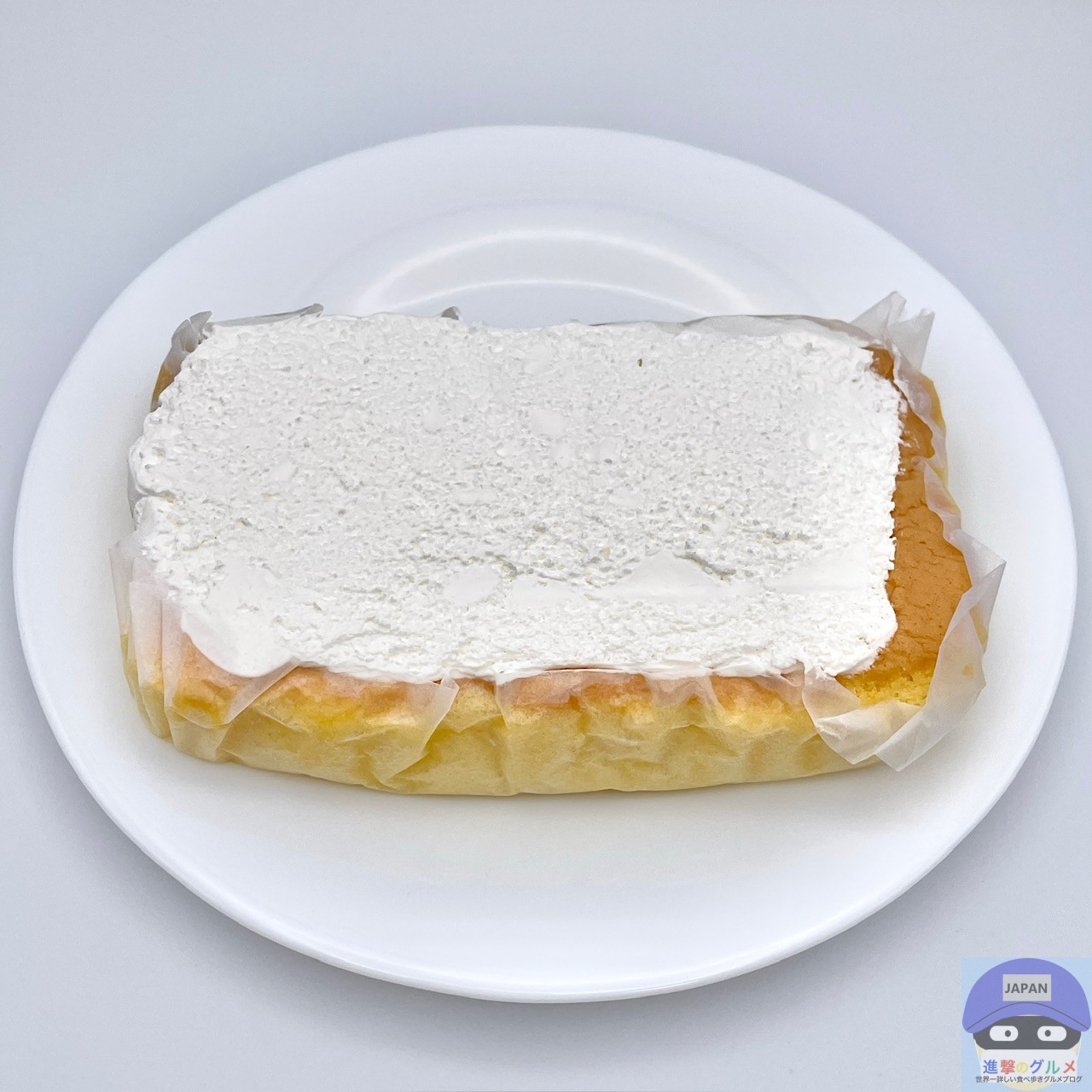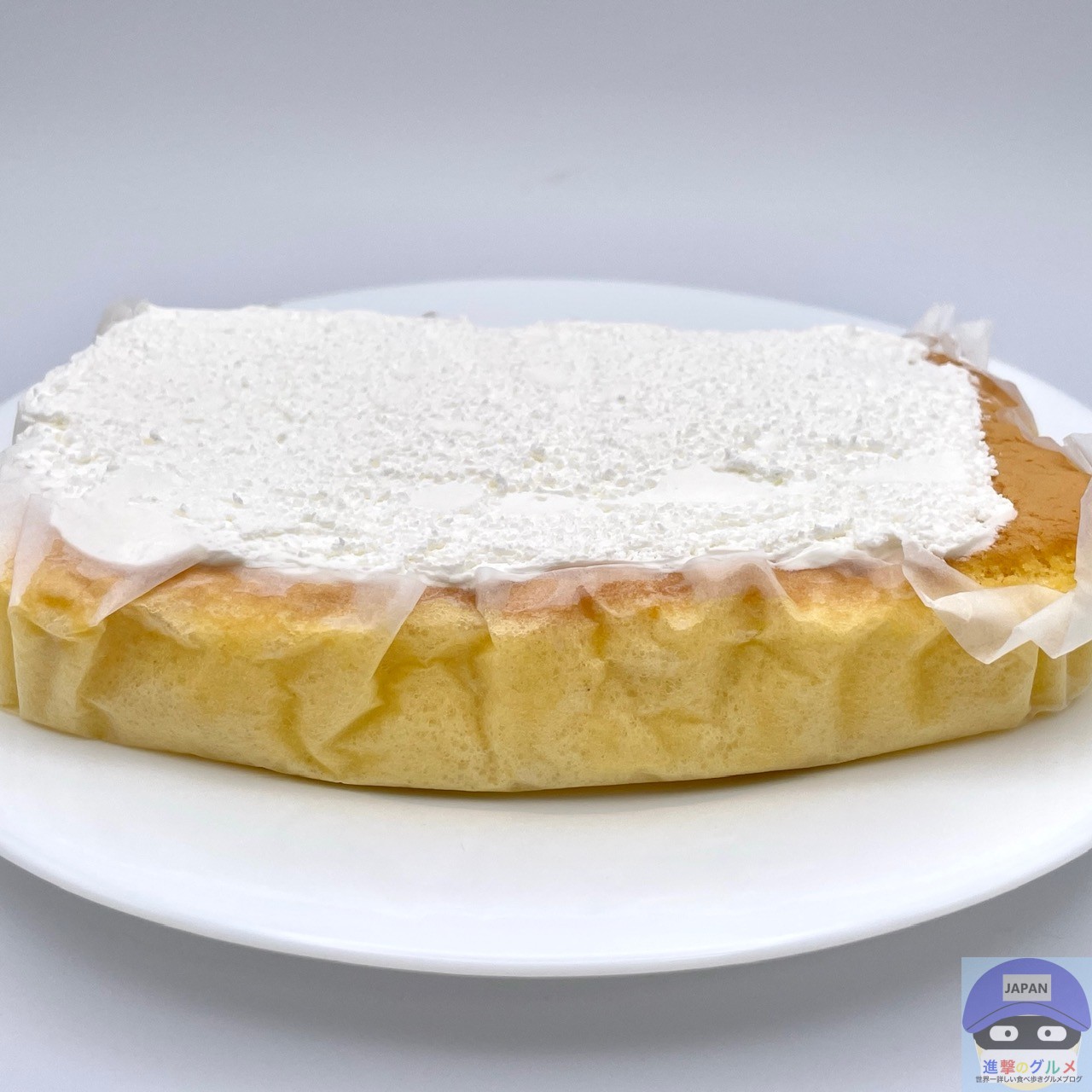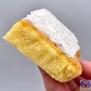 総重量50%増量の特別サイズ、大きめのシフォン生地にホイップクリームをたっぷりトッピングしたシンプルなコンビニスイーツです。