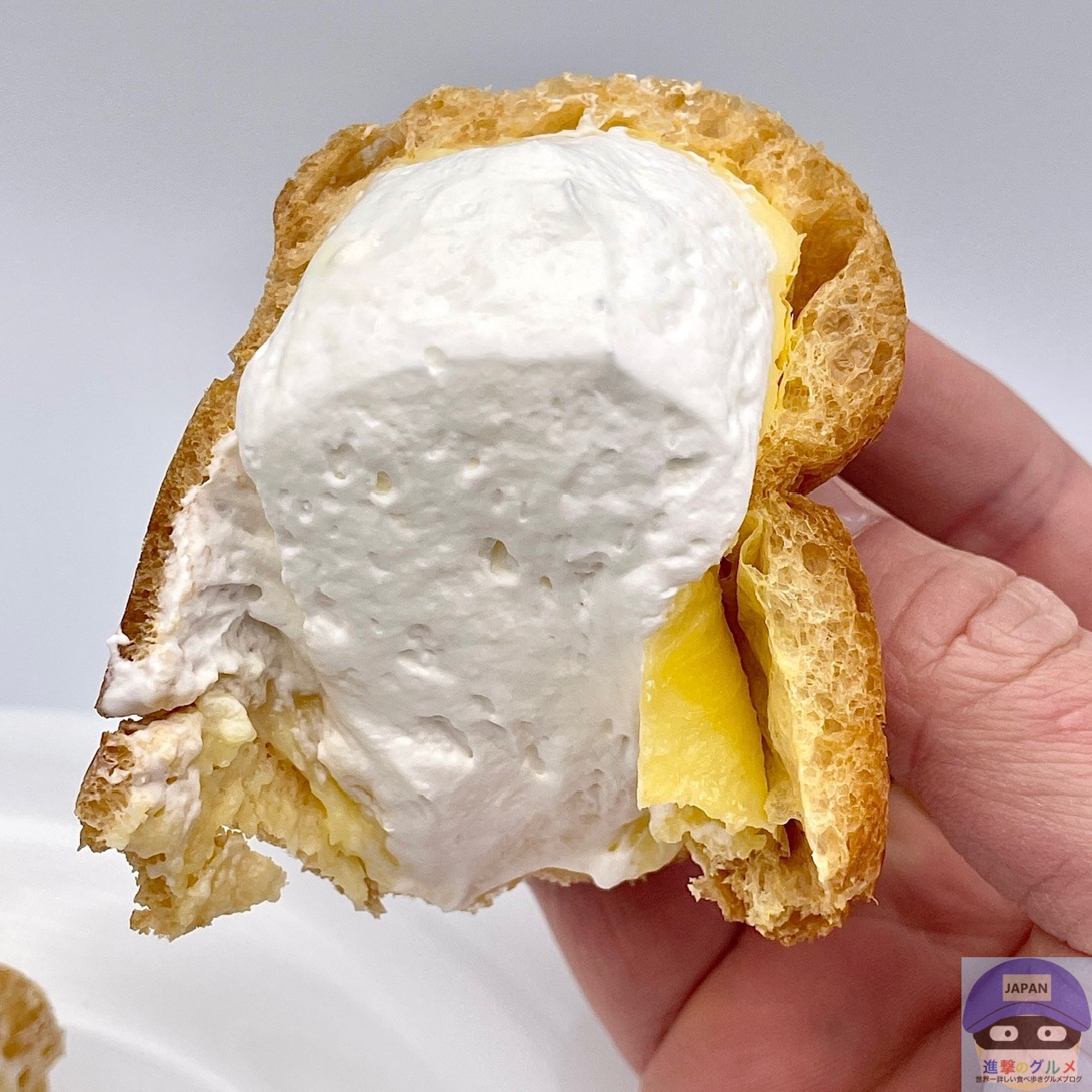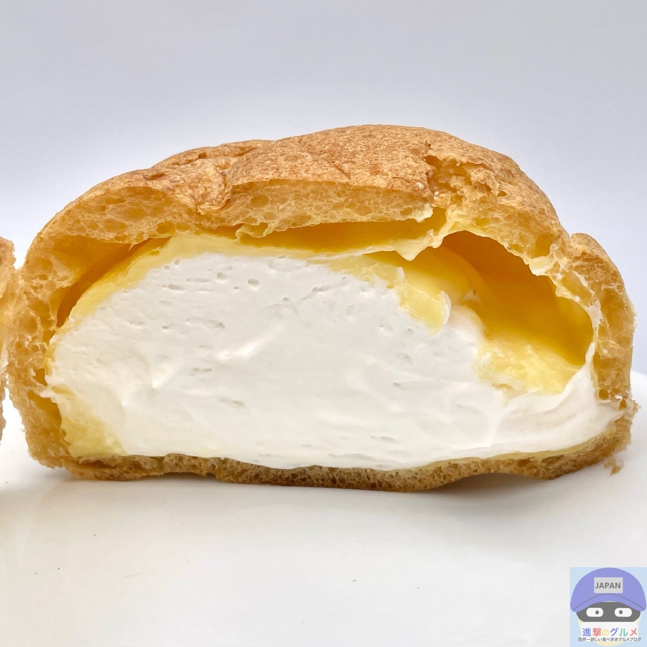 やわらかいシュー生地は、やや香ばしさのある味わい、たっぷりのクリームとシュー生地のシンプルな組み合わせ、1個で十分なボリュームと甘さです。