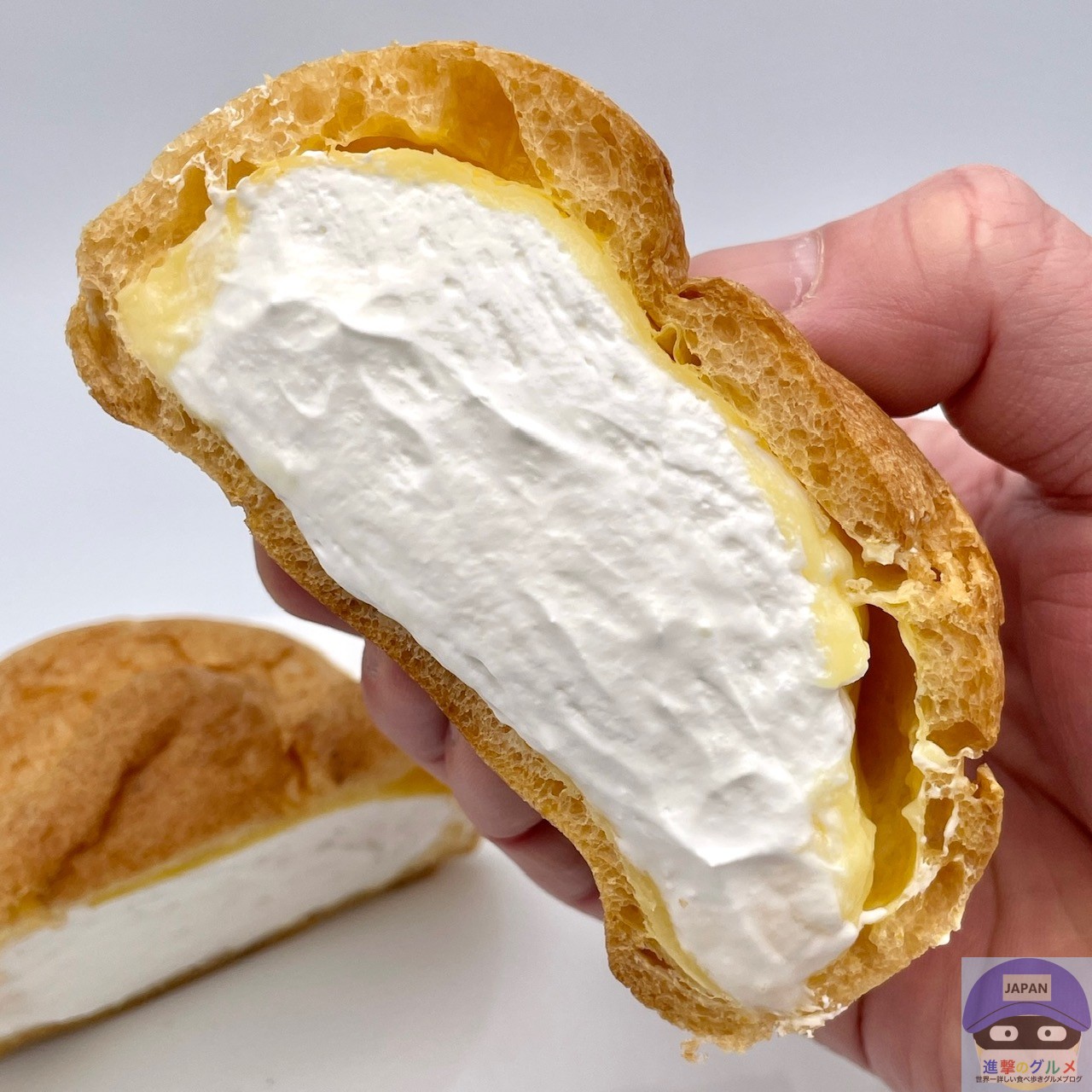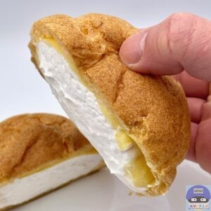 今回で7回目、お得な「盛りすぎチャレンジ」により、従来品の「大きなツインシュー」と比較して、価格据え置きでカスタードクリームとホイップクリームの量を約50%増量しました。