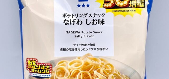 今回で7回目、お得な「盛りすぎチャレンジ」により、従来品の「ポテトリングスナック なげわ しお味 62g」と比較し、価格据え置きで内容量を約1.5倍、約50%増量しました。