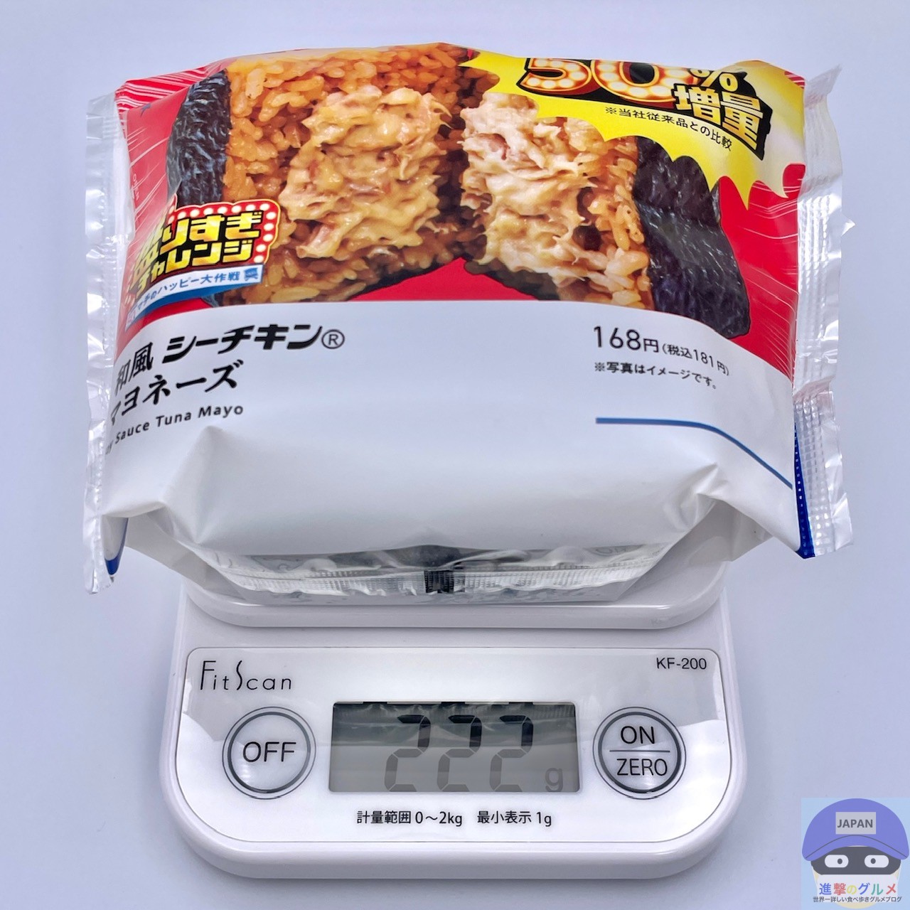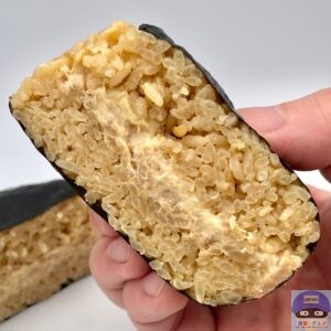 出汁と醤油ベースの調味液と一緒に炊いたご飯に、シーチキンマヨネーズを具材として入れたコンビニおにぎり、お値段そのまま総重量約50%増量でコスパ抜群です。