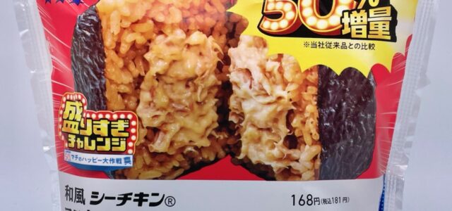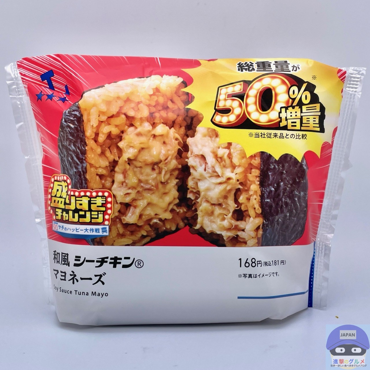 今回で6回目、お得な「盛りすぎチャレンジ」により、定番商品「和風シーチキンマヨネーズおにぎり」と比較し、価格据え置きで総重量が1.5倍、50%増量しました。