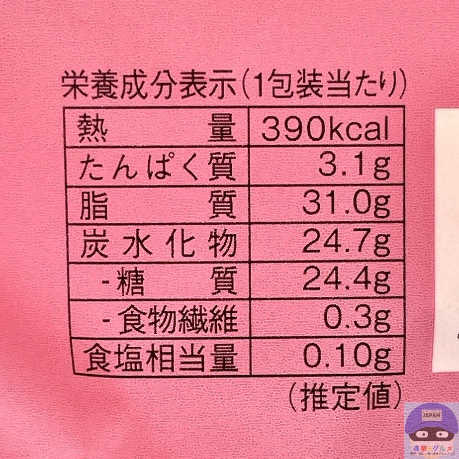 アレルギー物質表示(表面に記載)、栄養成分表示、原材料名などです。