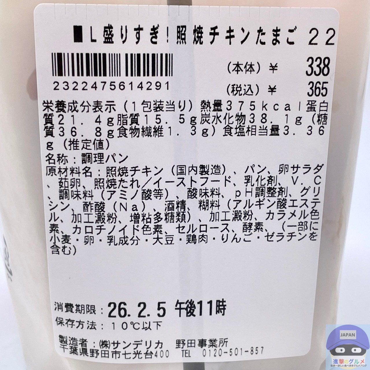 カロリーは375kcal、重さは包装を含めて231gです。