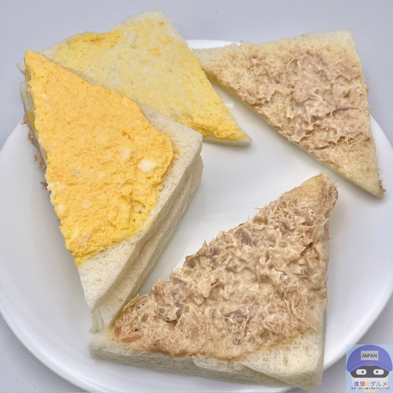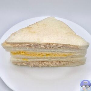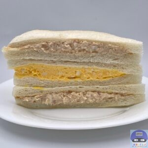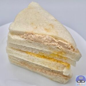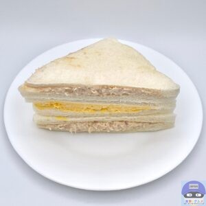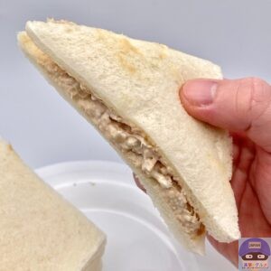 開封すると、ツナサラダを挟んだツナサンド2切れ、たまごサラダを挟んだたまごサンド1切れの組み合わせでシンプルな見た目です。