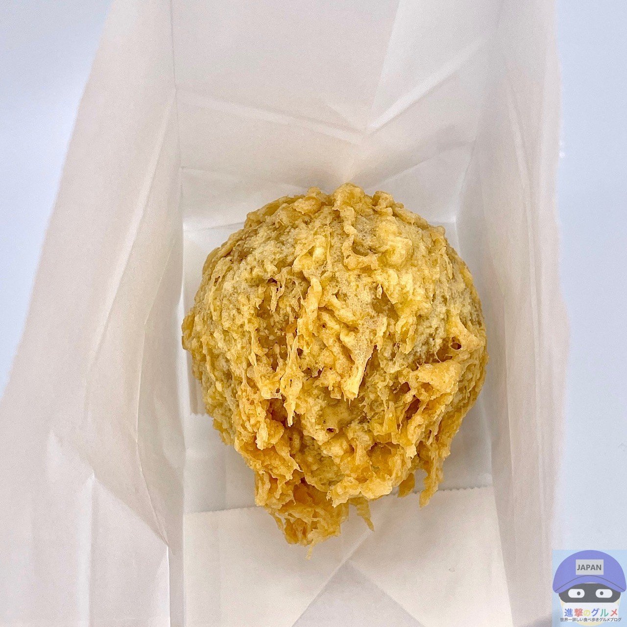 天ぷら持ち帰り用の無地の紙袋に、「元気玉おむすび 半熟玉子入り」が入っています。