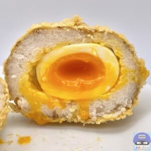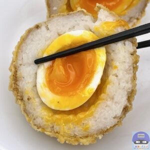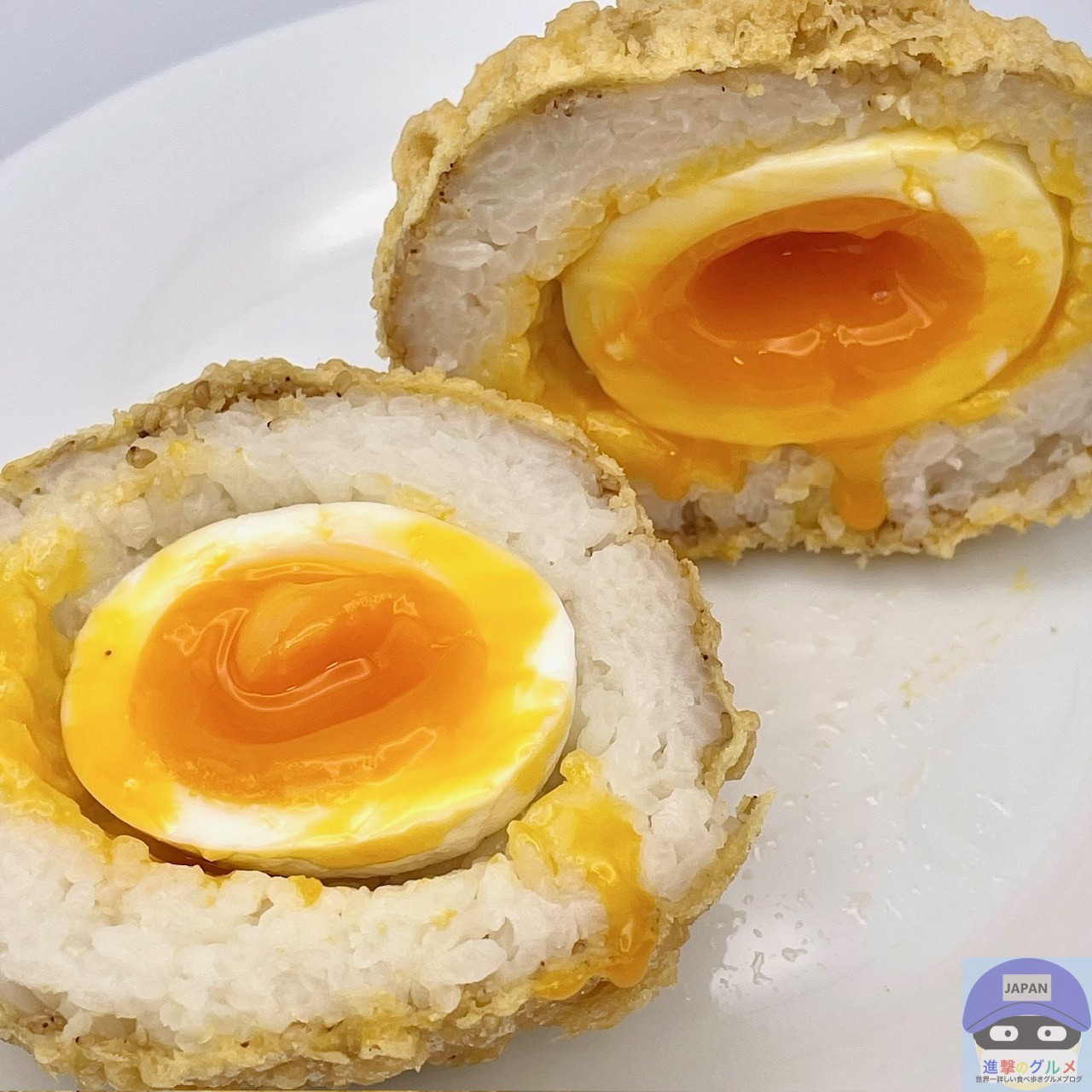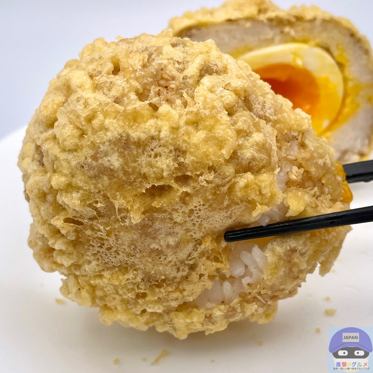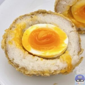 ご飯、衣、半熟玉子、白ごま、すりごまで作られた、シンプルで大きいおむすびです。