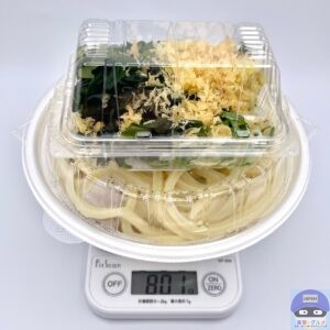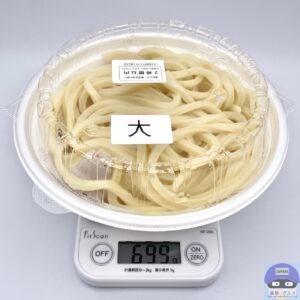 重さをはかると、かけうどん・大盛りは容器を含めて699gでした。