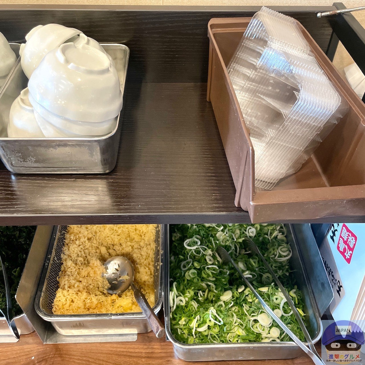 無料の薬味とトッピングは、おろししょうが、香七味、しび辛ラー油、わかめ、天かす、わさび、すりごま、青ねぎの8種類です。