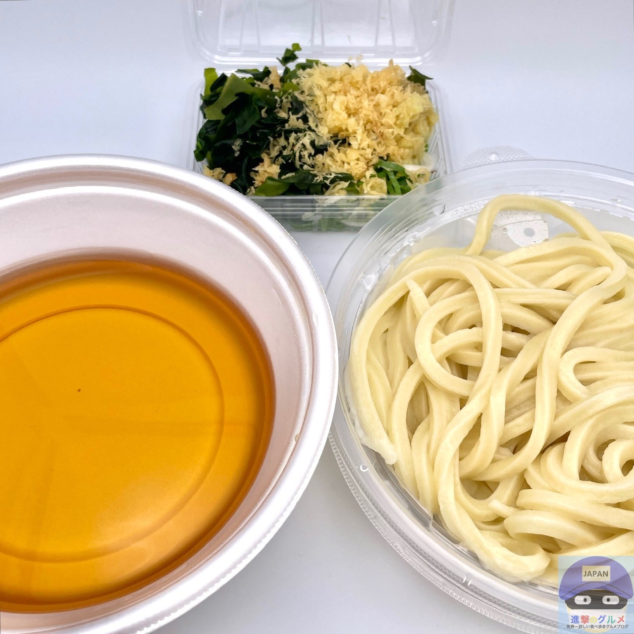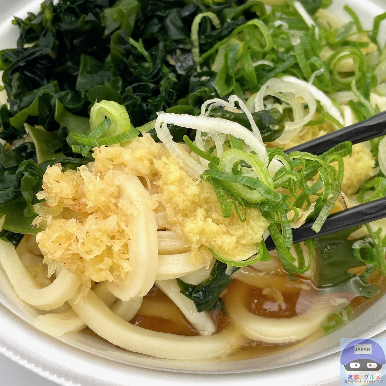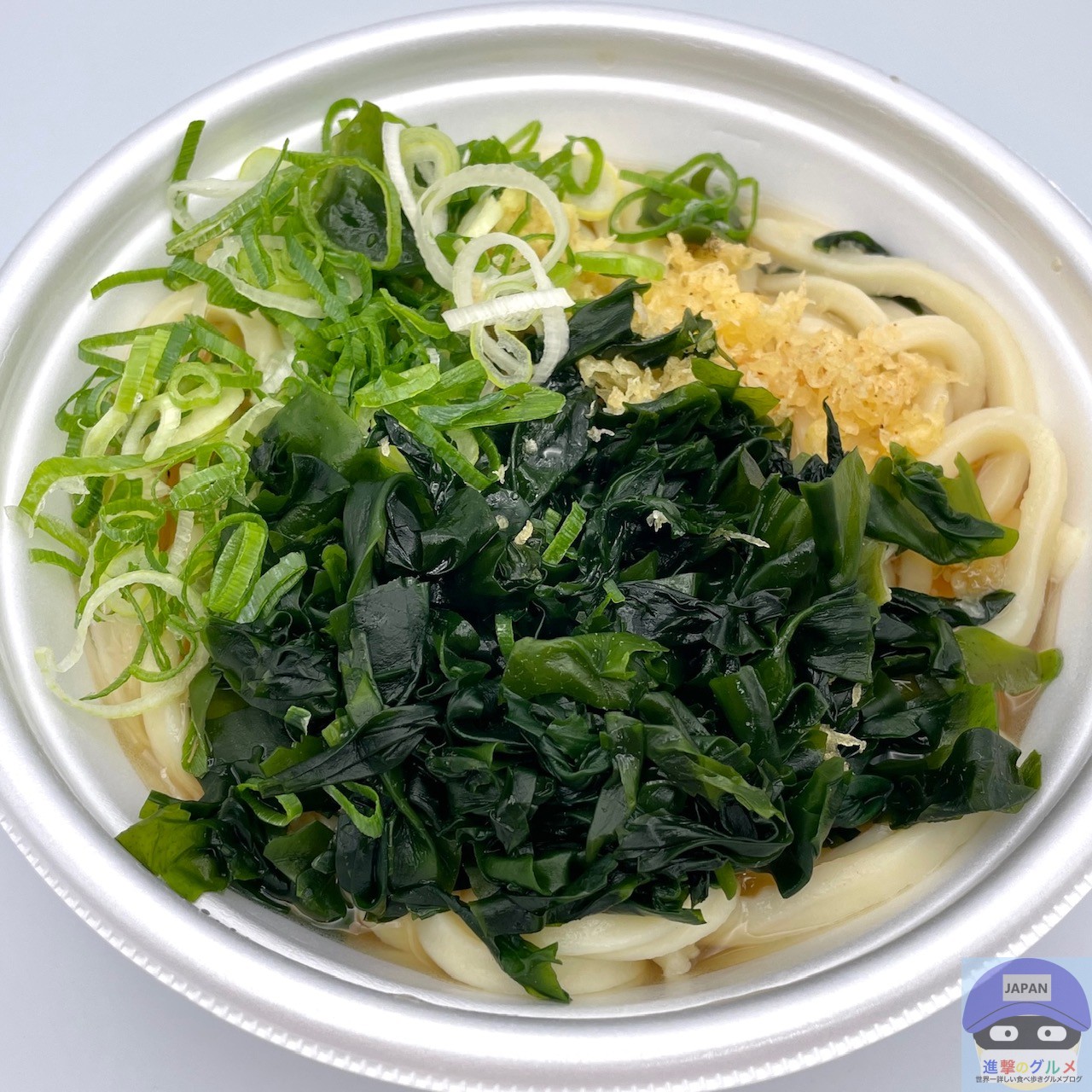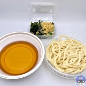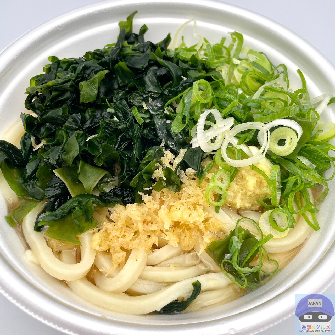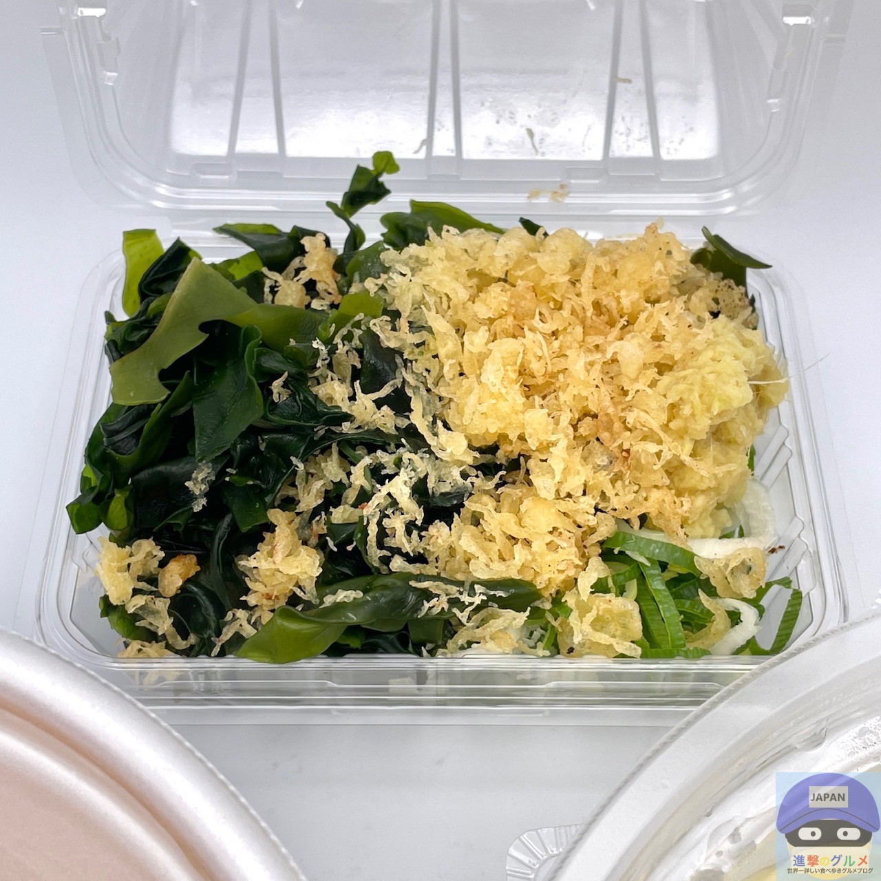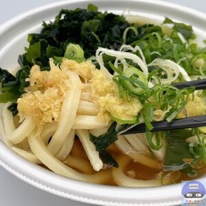 薬味・トッピングは、おろししょうが、わかめ、天かす、青ねぎを取りました。