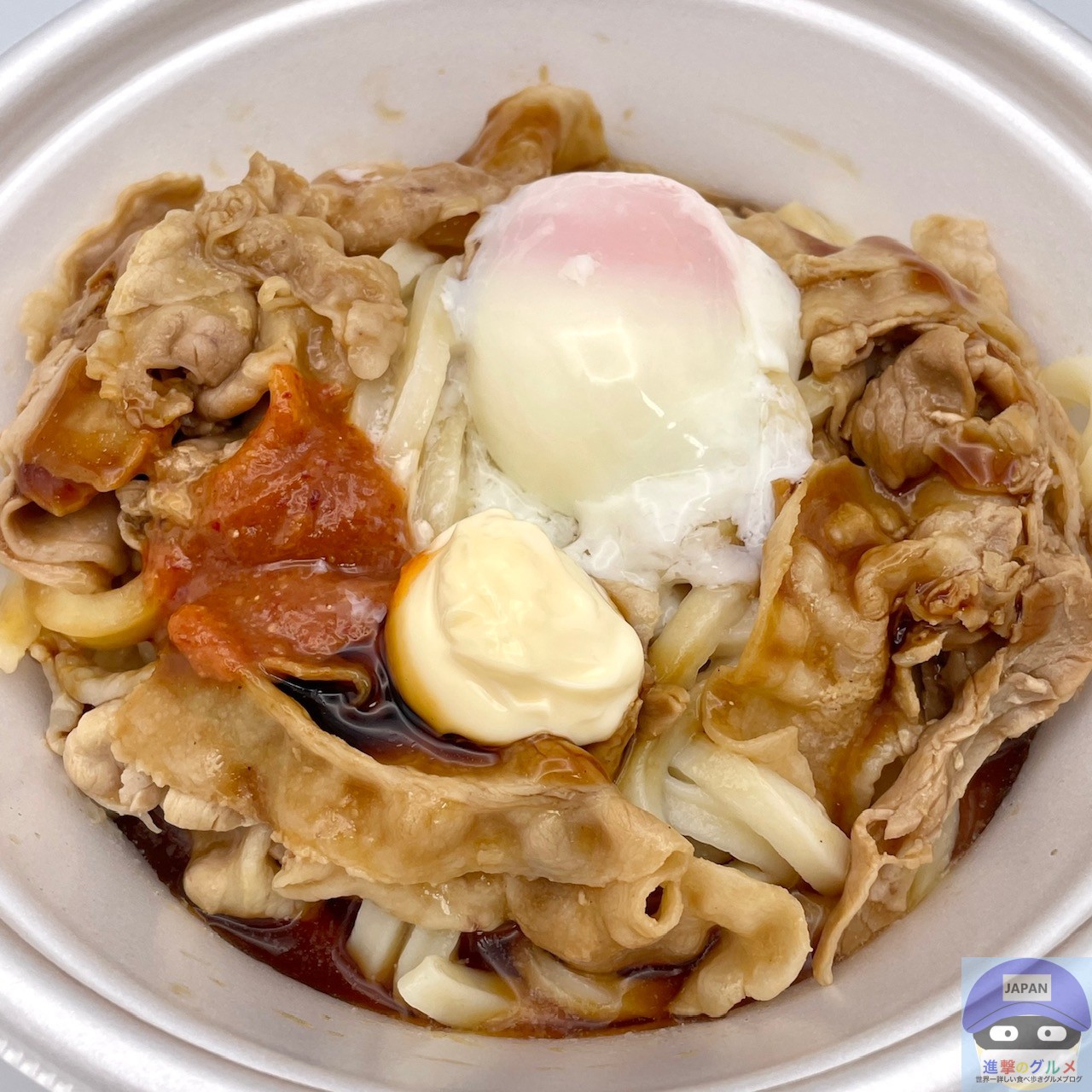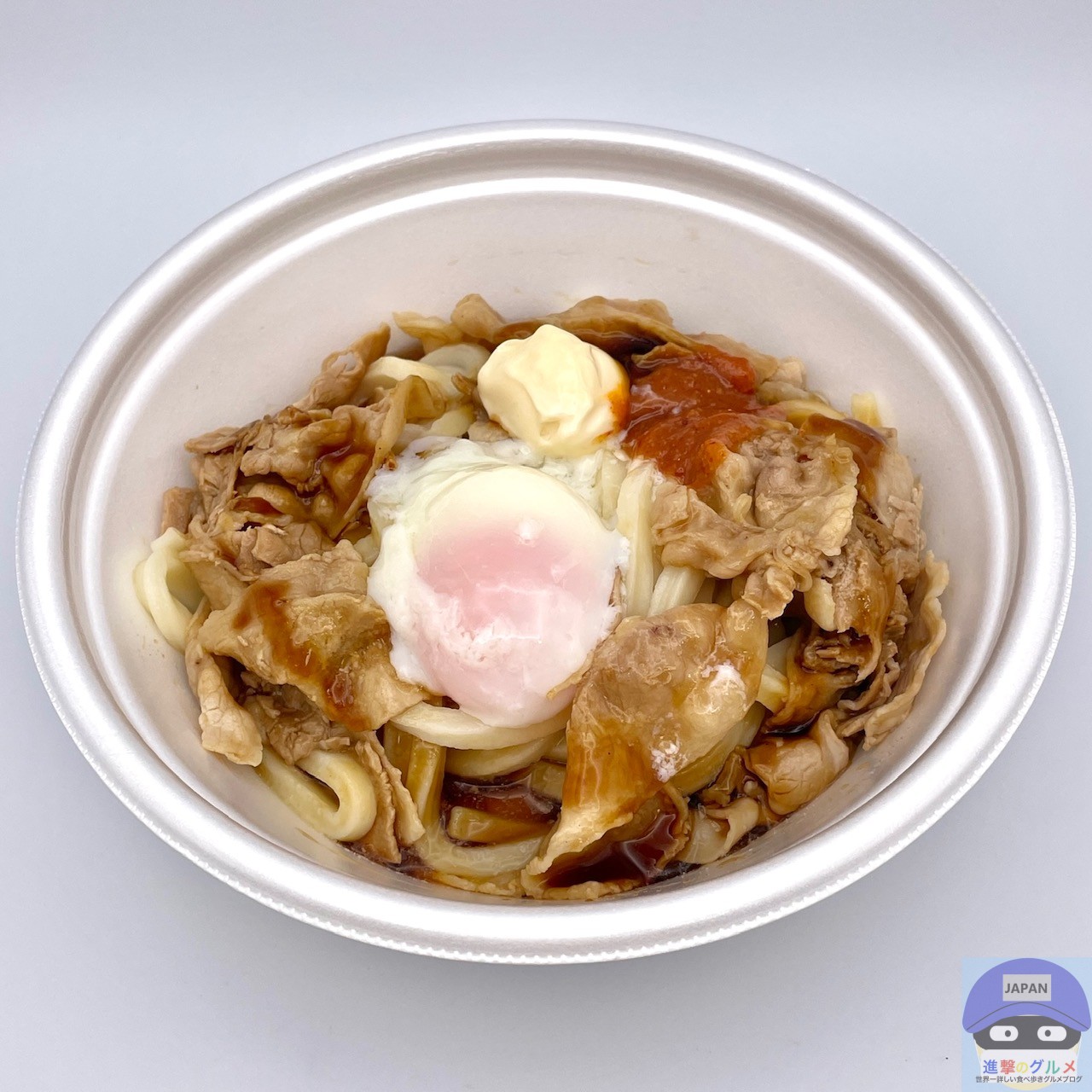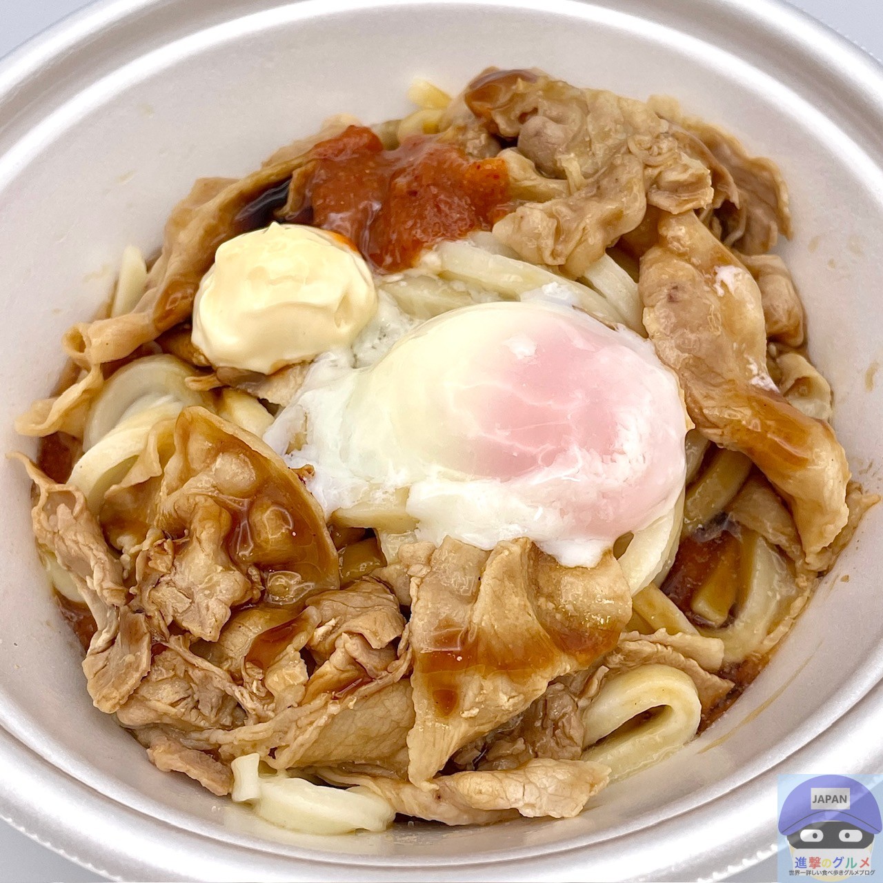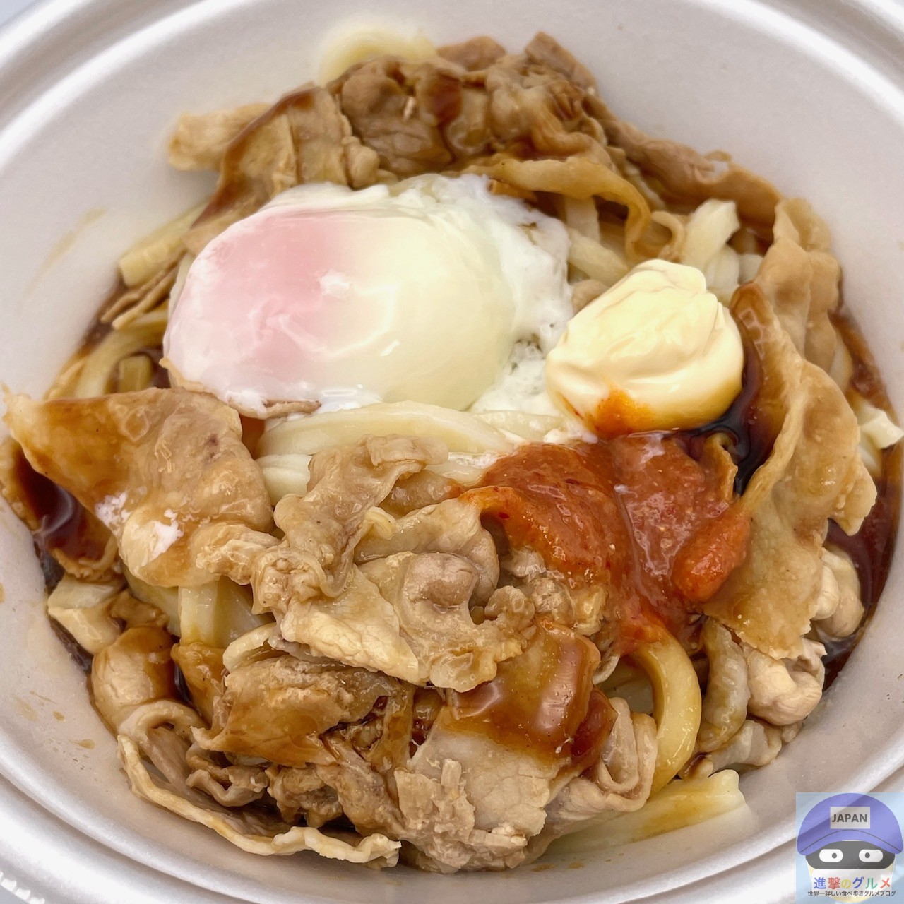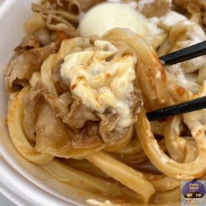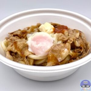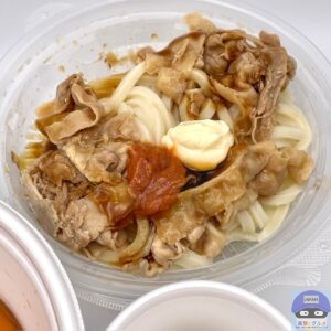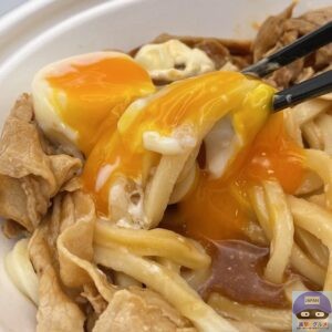 締めた冷たいうどん、冷たいぶっかけだし、豚バラ肉、特製甘辛醤油ダレ、特製辛味噌、マヨネーズ、温泉玉子などで作られています。