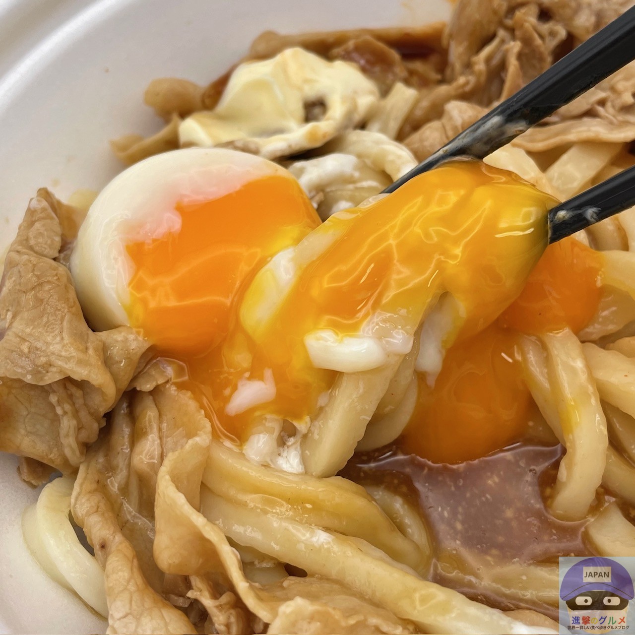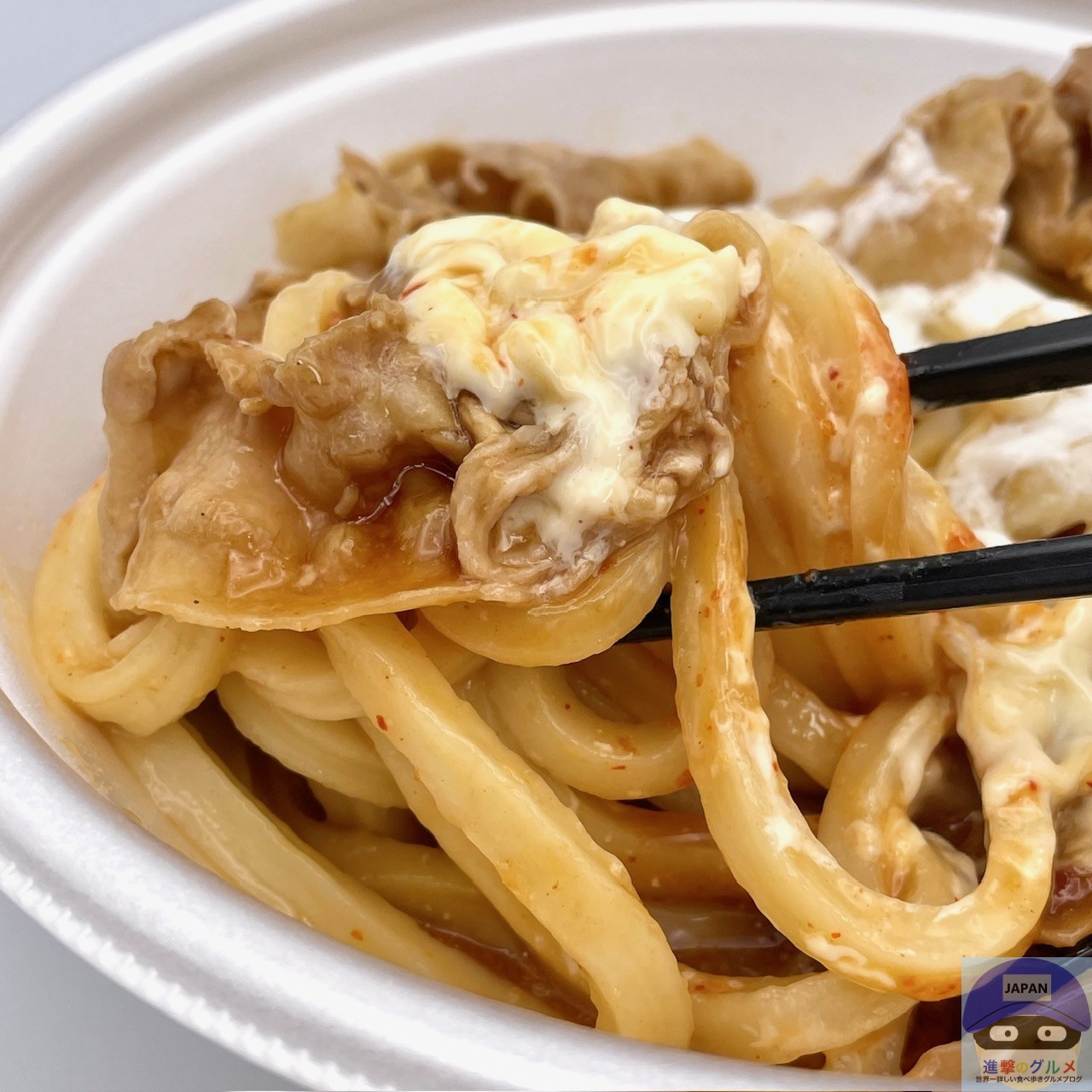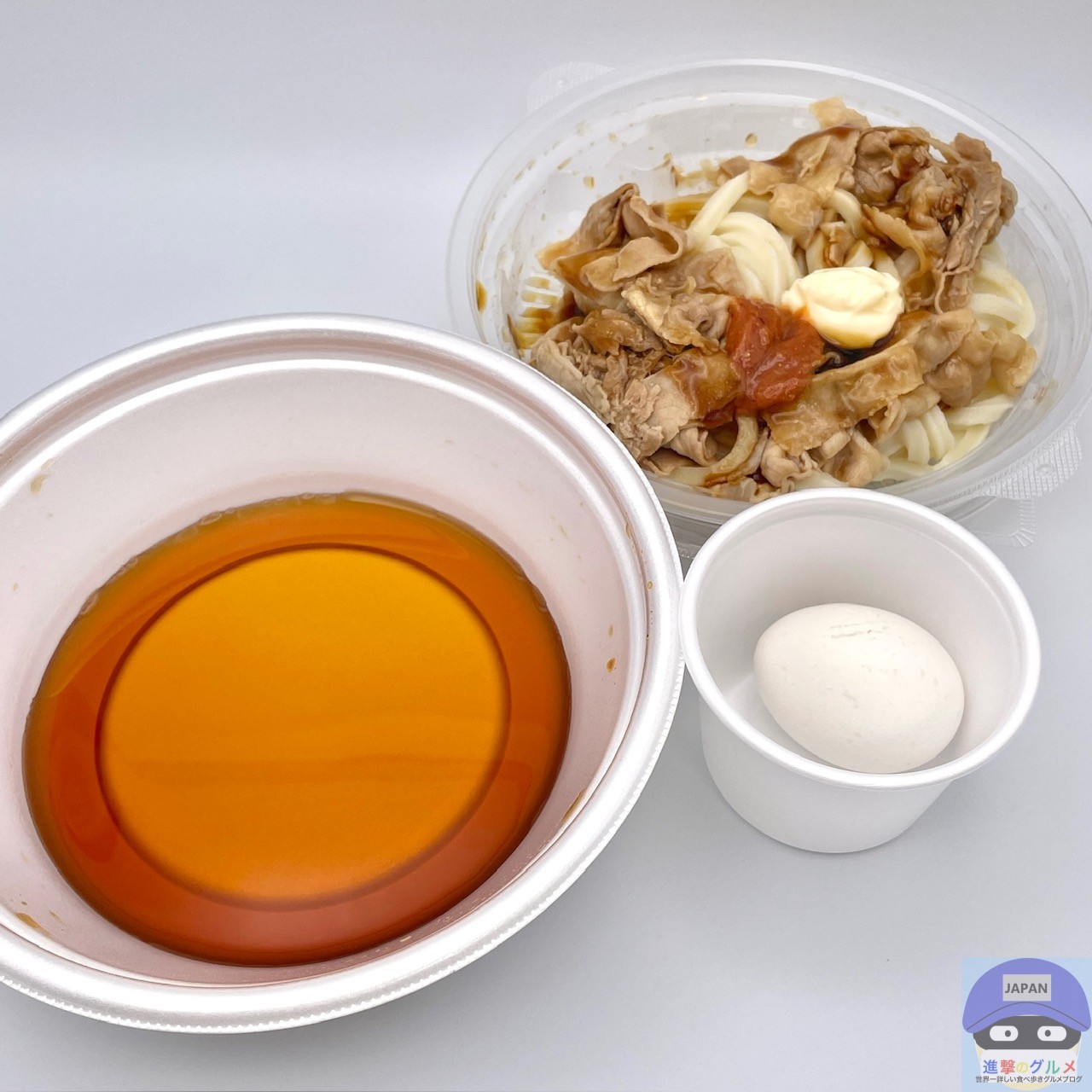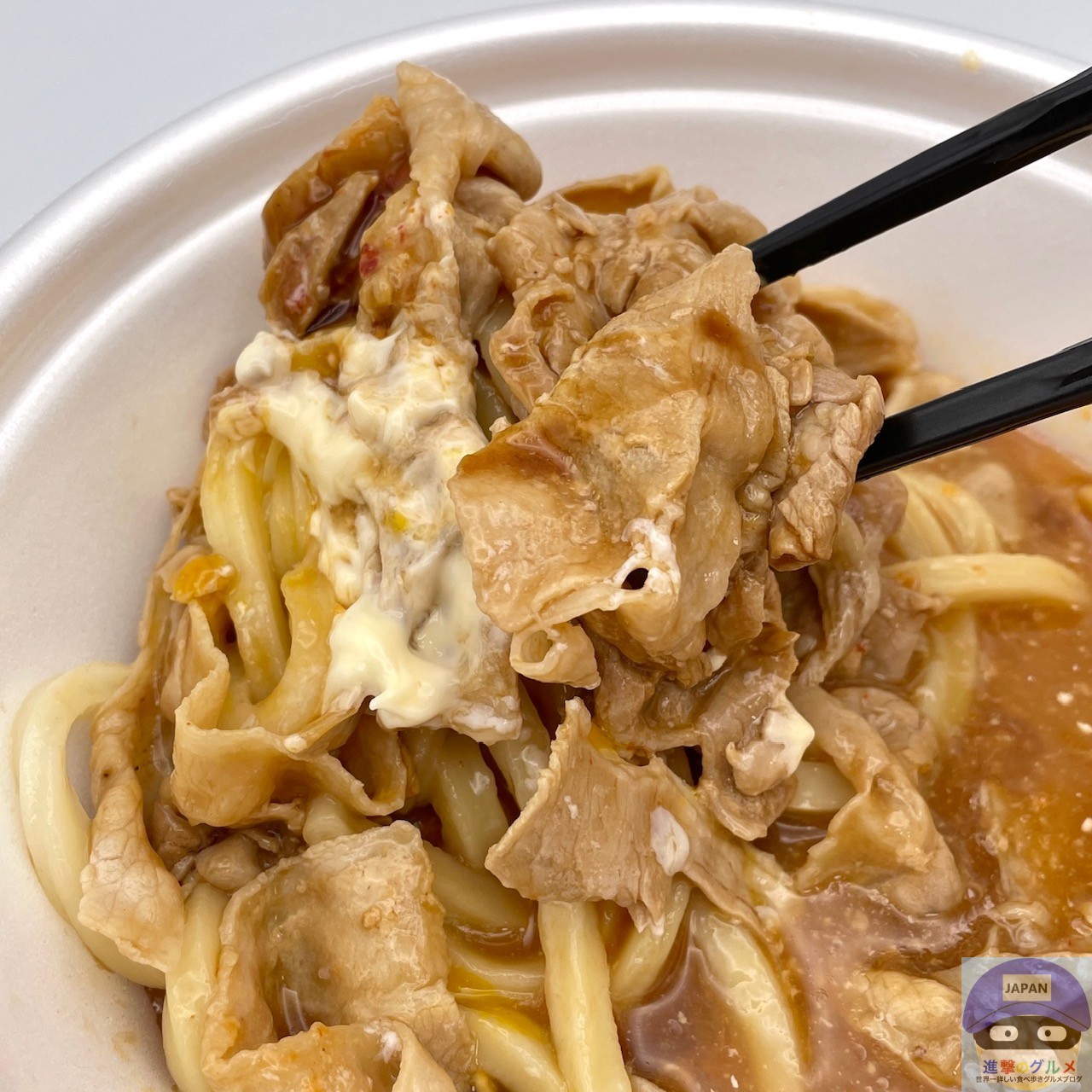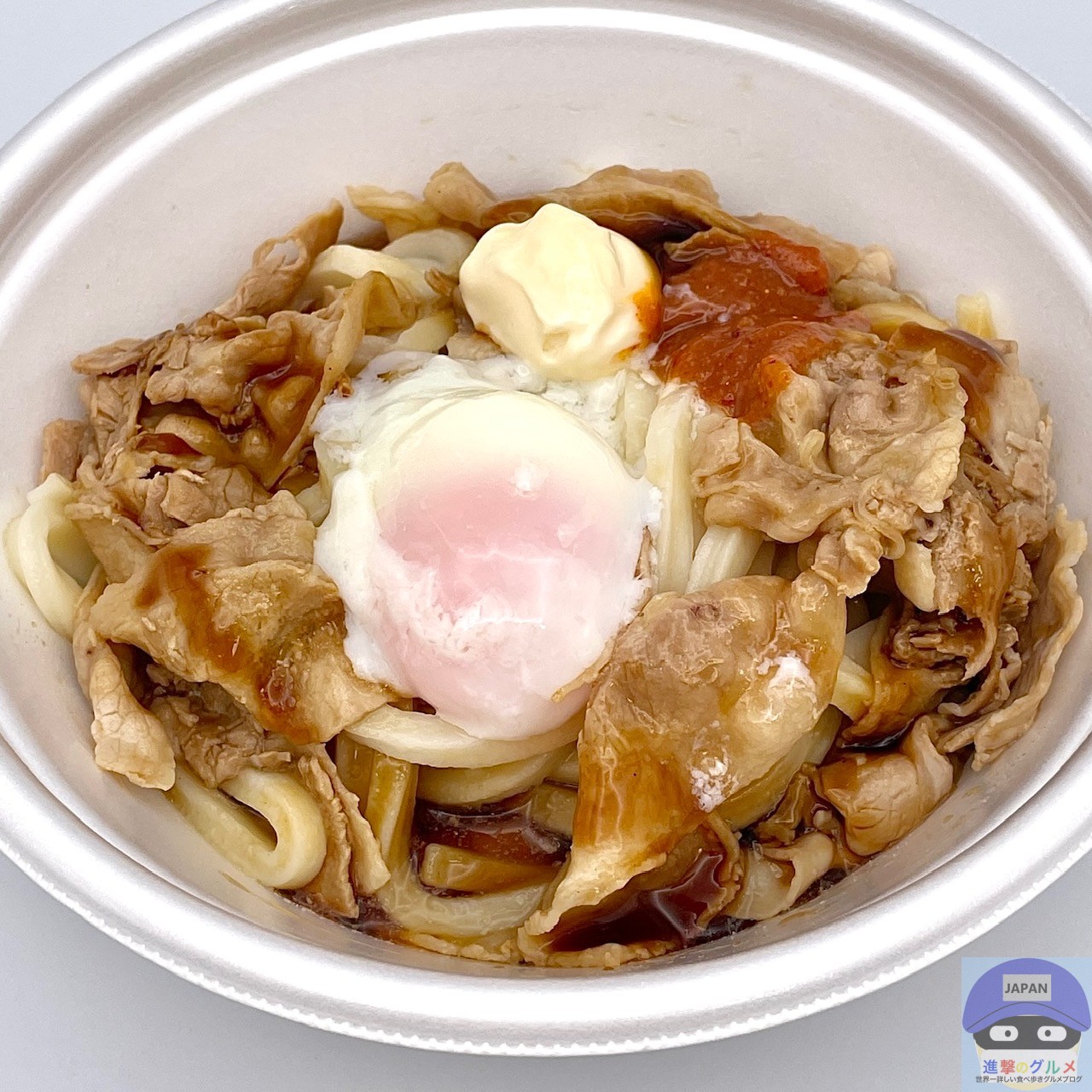 締めた冷たいうどん、冷たいぶっかけだし、豚バラ肉、特製甘辛醤油ダレ、特製辛味噌、マヨネーズ、温泉玉子などで作られています。