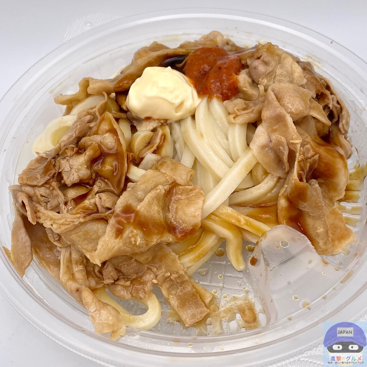 特製甘辛醤油ダレが絡んだ薄切りの豚バラ肉の肉肉しさと旨み、ぶっかけだしの風味よい旨み、にんにくの効いた特製辛味噌のピリ辛さ、マヨネーズのこってり感が食欲を刺激します。