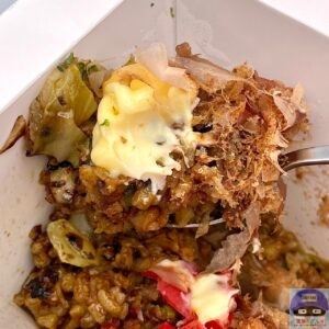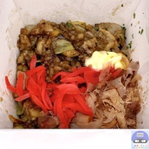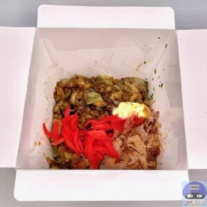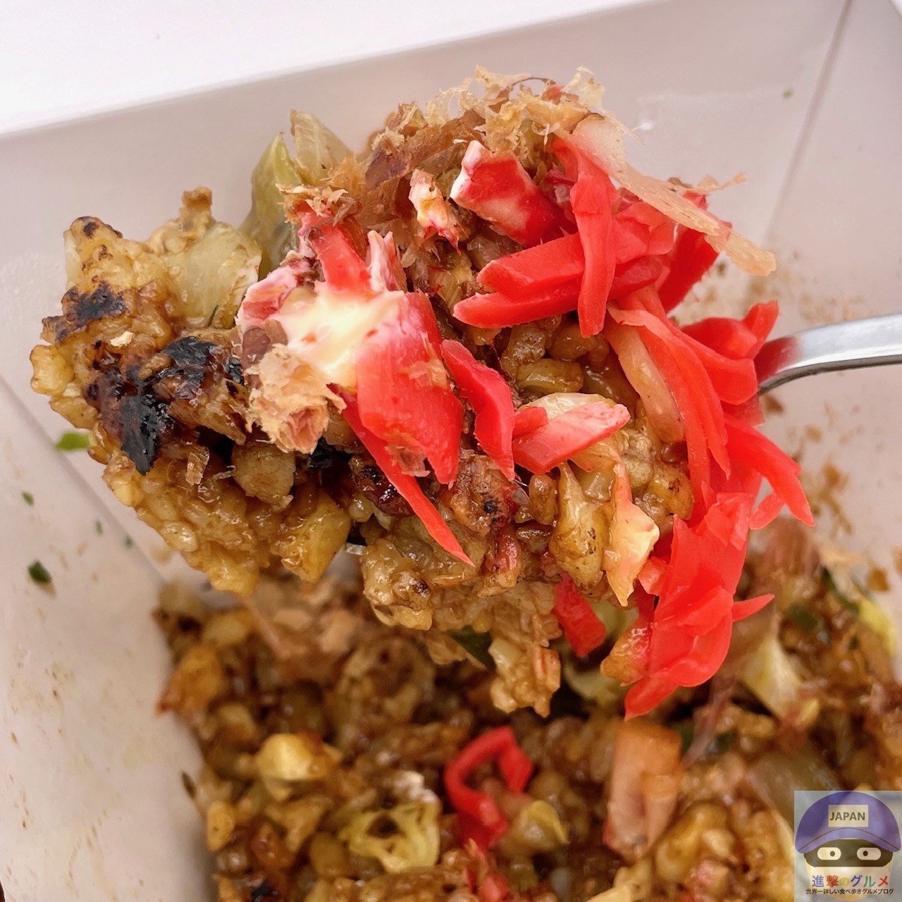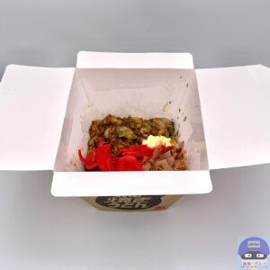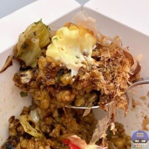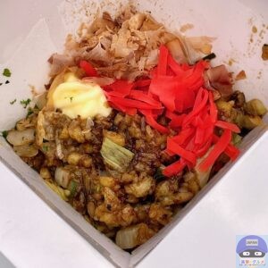 ご飯・うどん・特製ソース・豚肉・キャベツ・玉ねぎ・青のり・マヨネーズ・かつお節・紅生姜などで作られています。