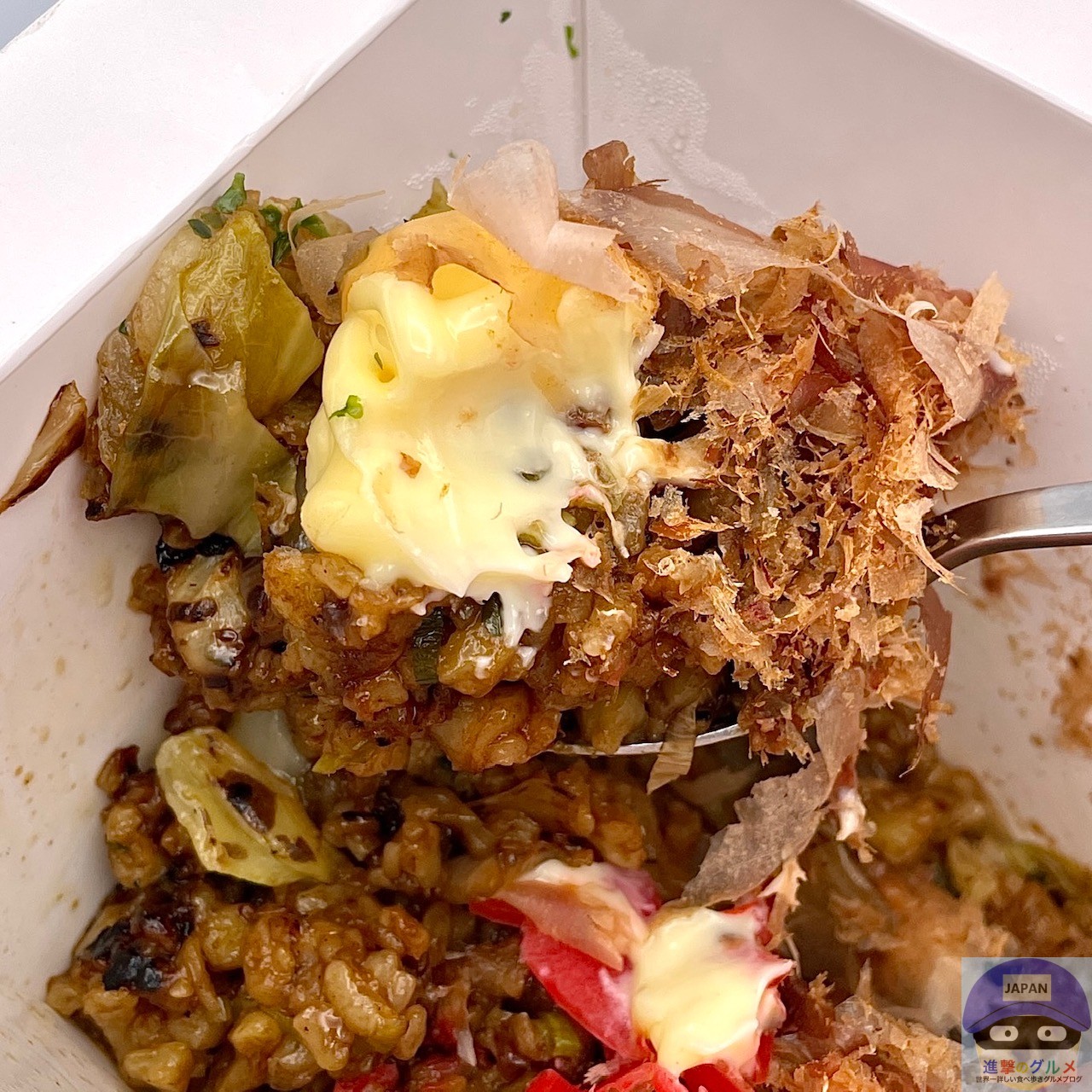 スパイスを効かせた特製ソースの濃い旨みと焼き上げた香ばしさ、キャベツと玉ねぎのシャキシャキ食感と甘みが食欲を刺激します。