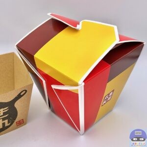 ポップなデザインの専用BOX、熱くても持てるように紙スリーブ付き、バイオマスプラスチックのスプーンも付いています。