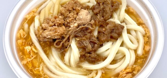 打ち立てうどんに、丁寧に仕込んだふわふわとろとろ、白だしベースのやさしい玉子あんかけ、甘辛く味付けして焼き上げた牛肉、針しょうがをピリリと効かせた鶏と豚の合わせそぼろをのせた一杯です。