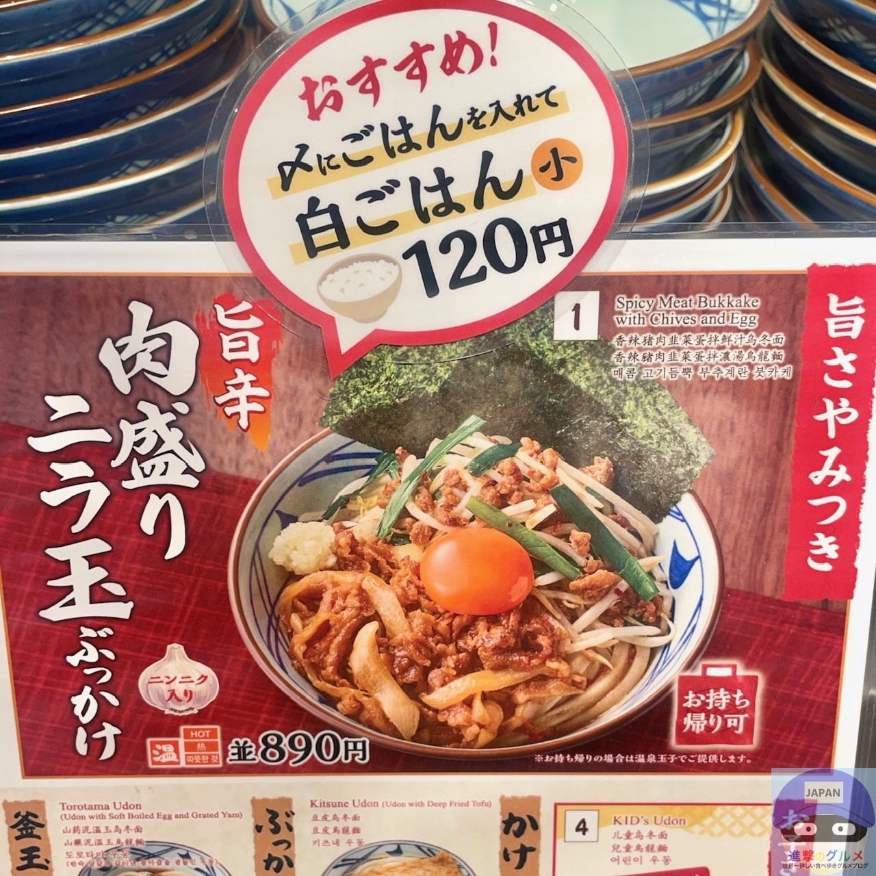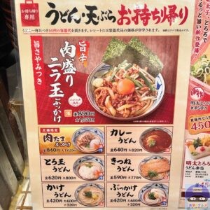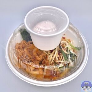 今回は、期間限定メニュー「旨辛 肉盛りニラ玉ぶっかけうどん・並(890円)」、「容器代(+50円)」を注文してテイクアウトしました。