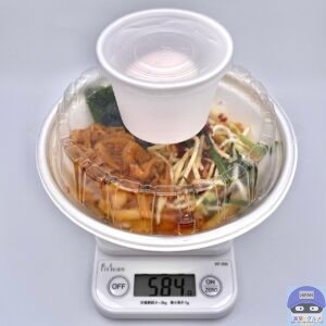 温泉玉子が付いて、重さをはかると、容器を含めて584gでした。