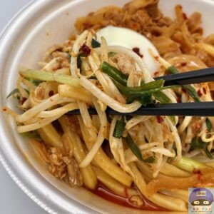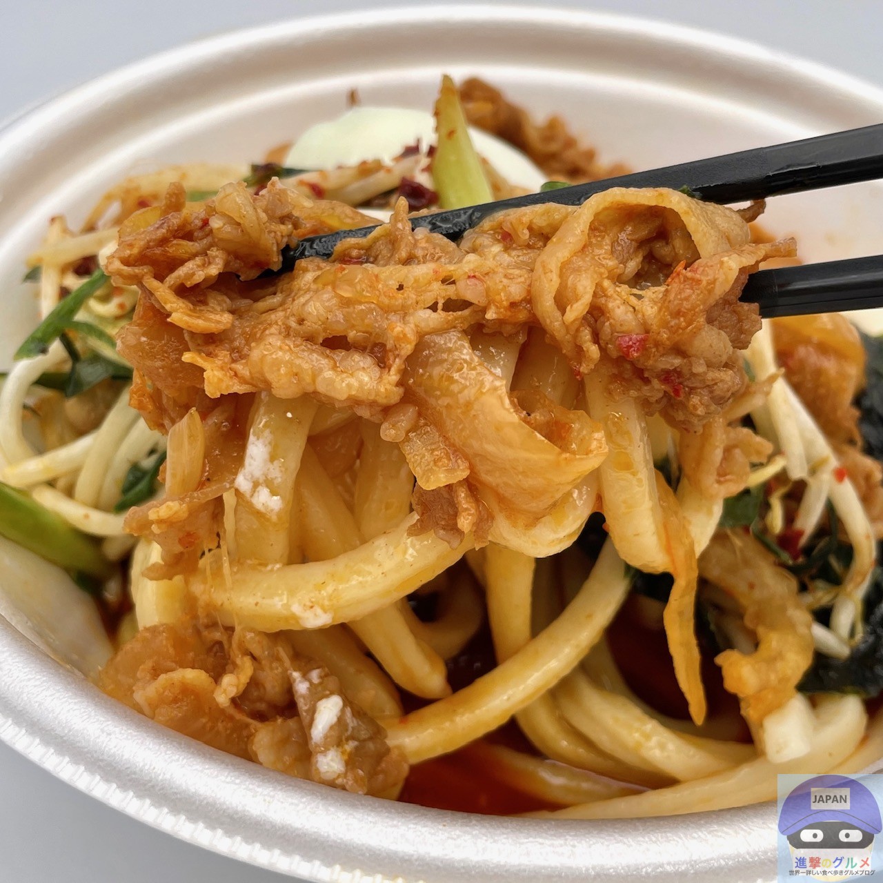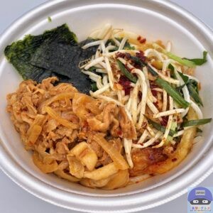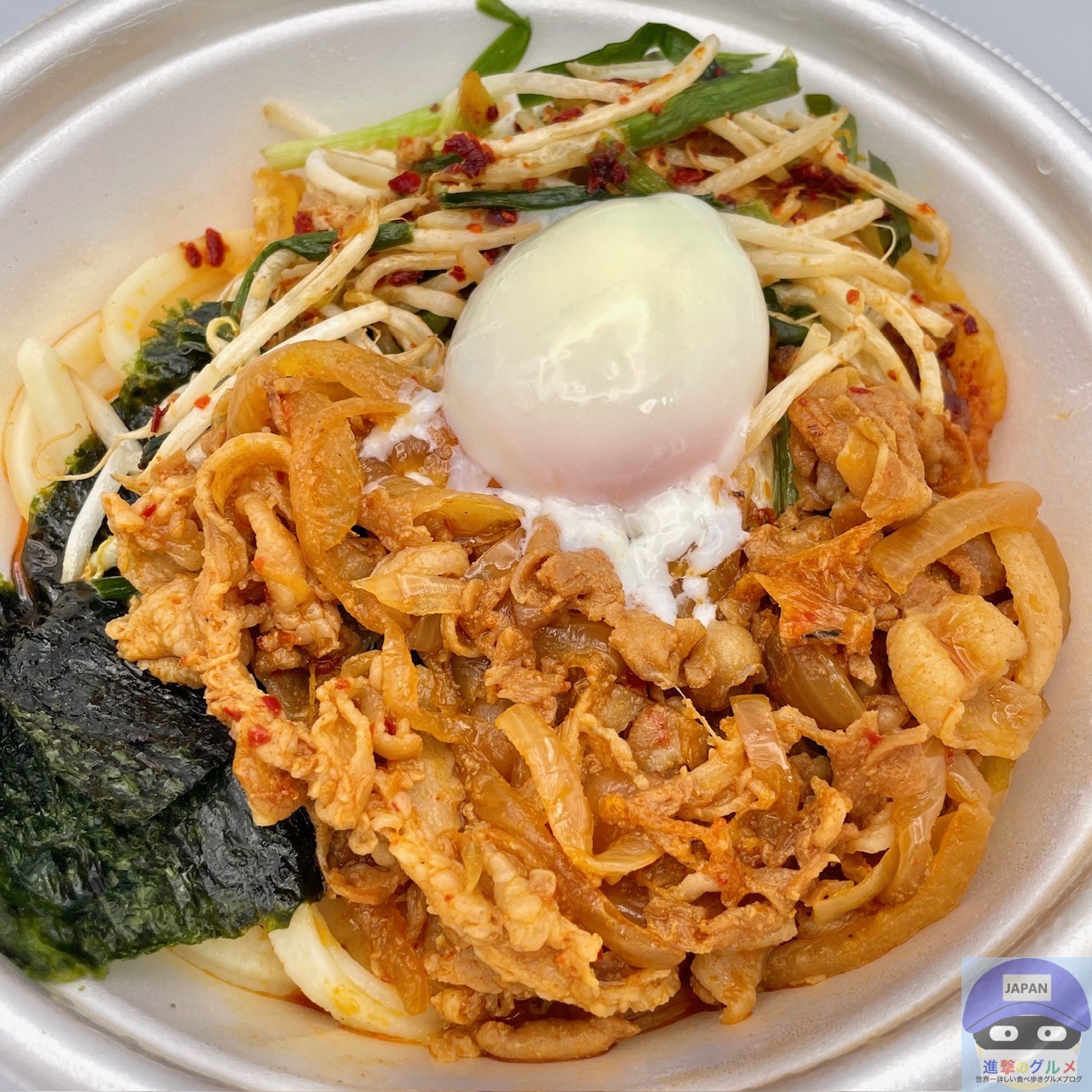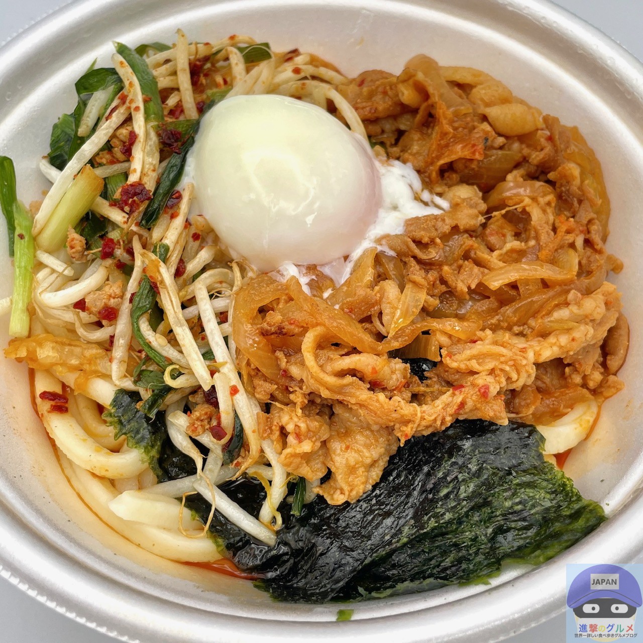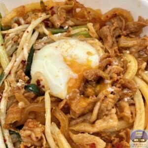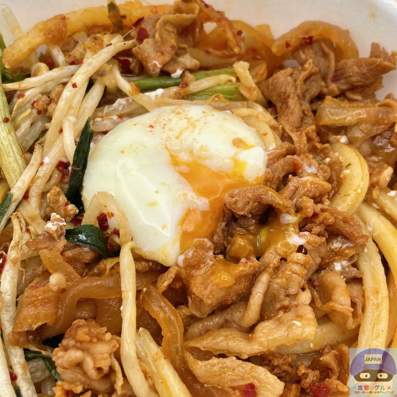 打ち立てうどん、ニンニク・唐辛子・ごま油などを使用した旨辛ぶっかけだし、豚肉と素揚げした玉ねぎの旨辛炒め、素揚げした肉そぼろ入りニラもやし、海苔、温泉玉子の組み合わせです。