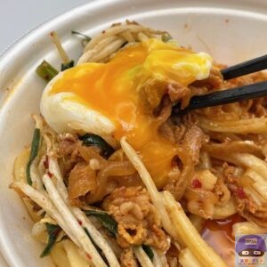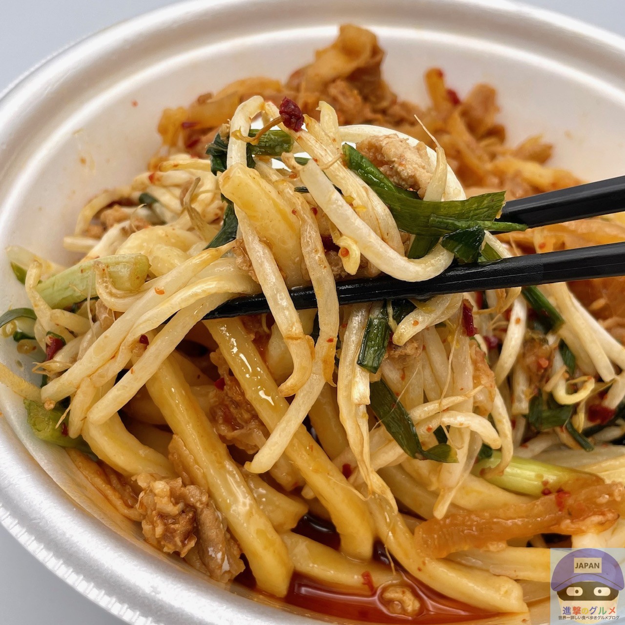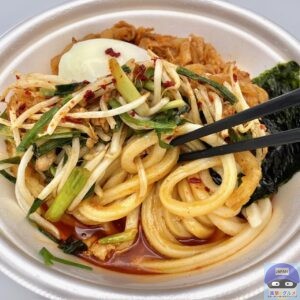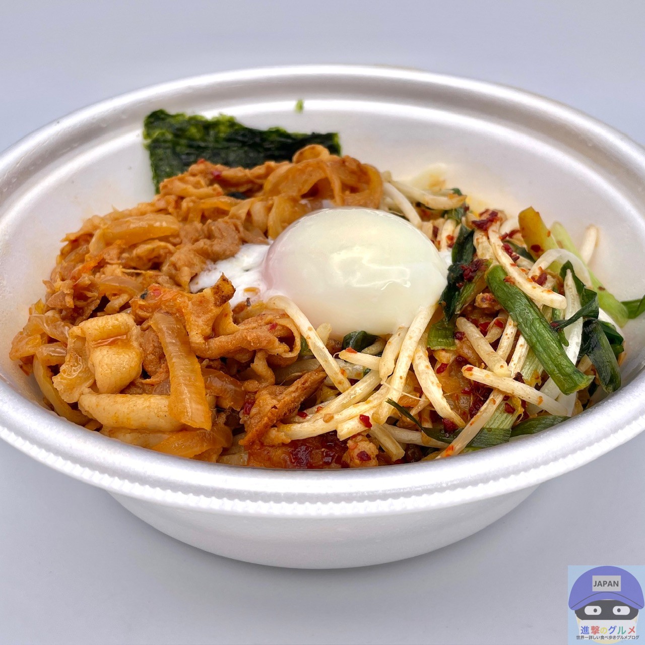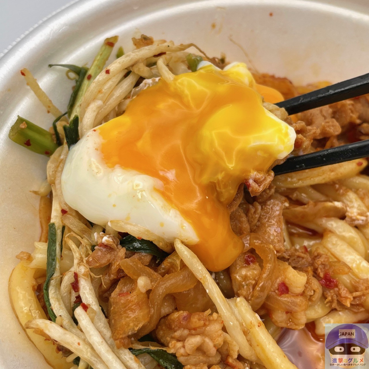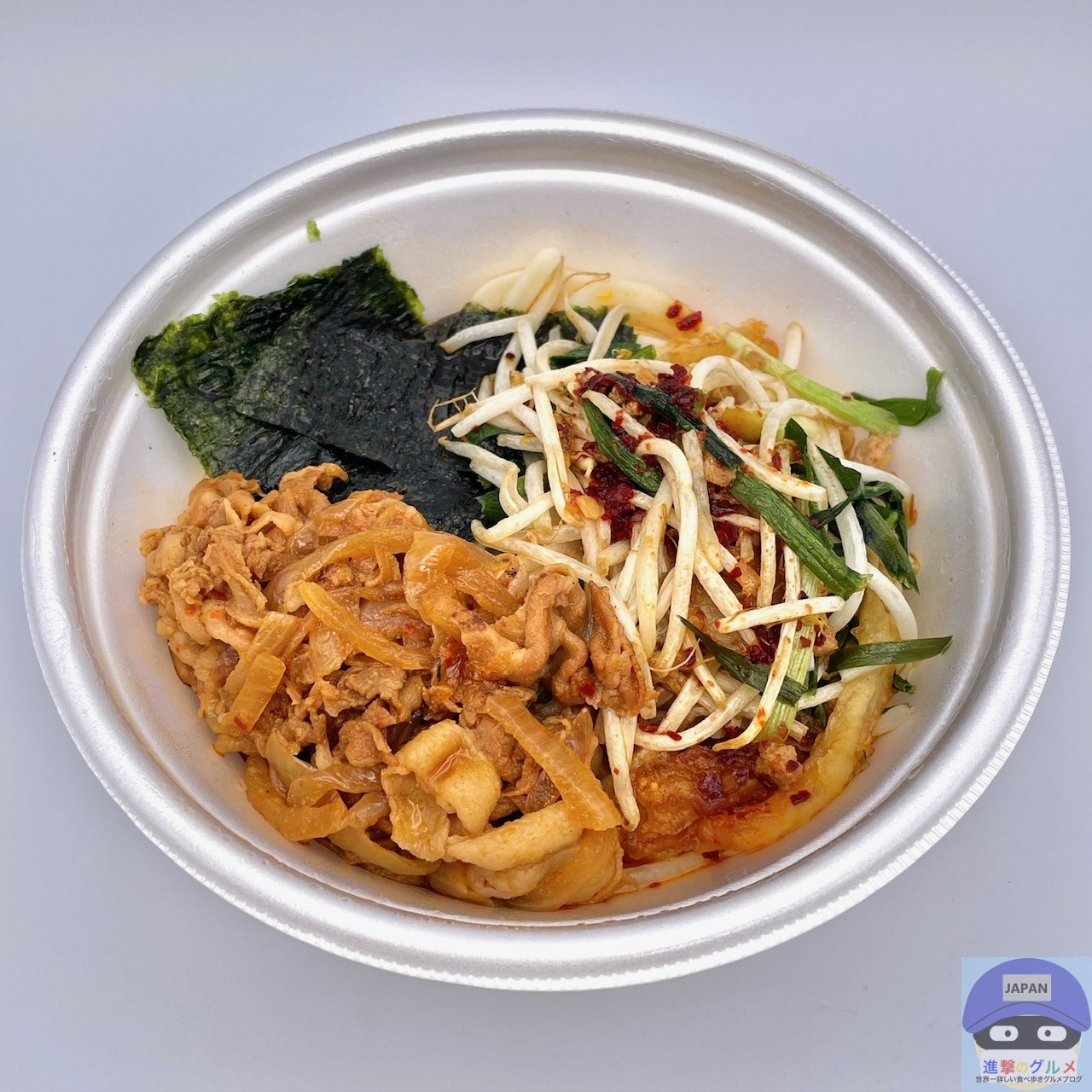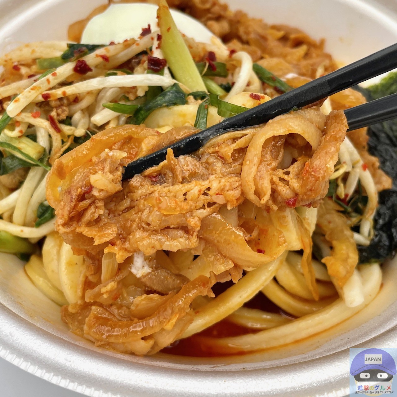 打ち立てうどん、ニンニク・唐辛子・ごま油などを使用した旨辛ぶっかけだし、豚肉と素揚げした玉ねぎの旨辛炒め、素揚げした肉そぼろ入りニラもやし、海苔、温泉玉子の組み合わせです。