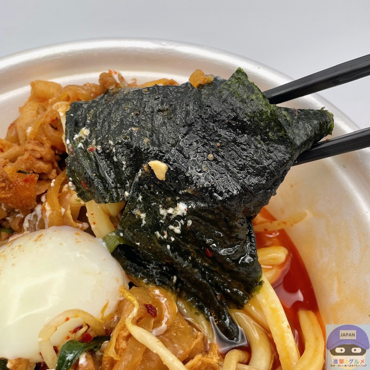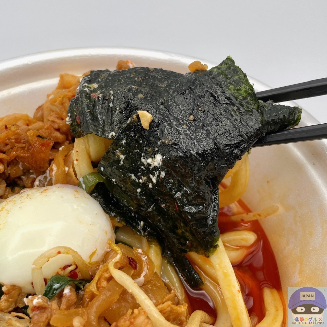 具だくさんで魅力的な見た目、ニラと海苔の香りが食欲をそそります。