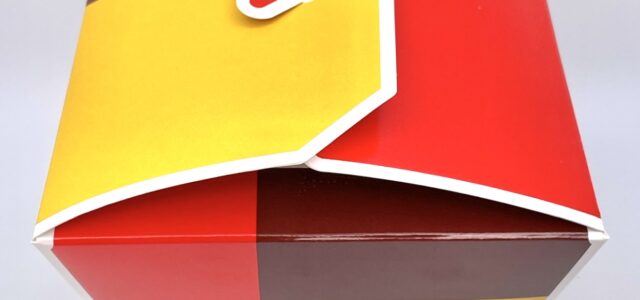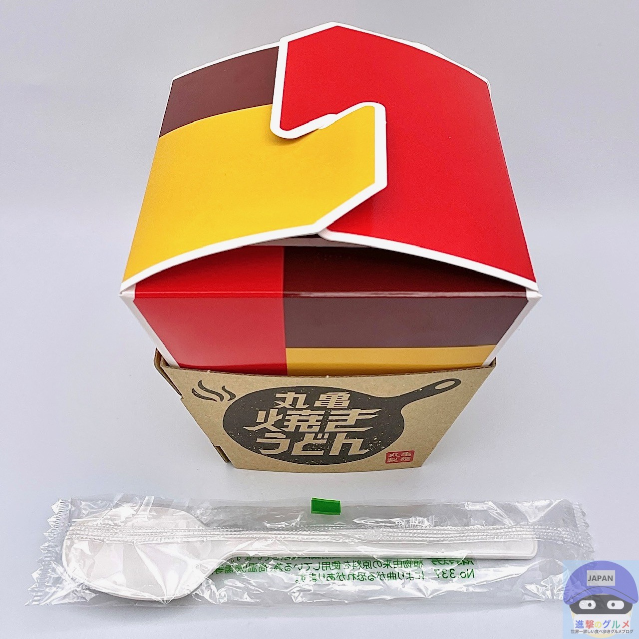 ポップなデザインの専用BOX、熱くても持てるように紙スリーブ付き、バイオマスプラスチックのスプーンも付いています。