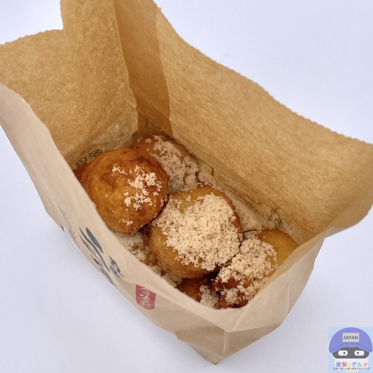 専用の紙袋に入った「丸亀うどーなつ」をパウダーで「きび糖味」に味付けをします。