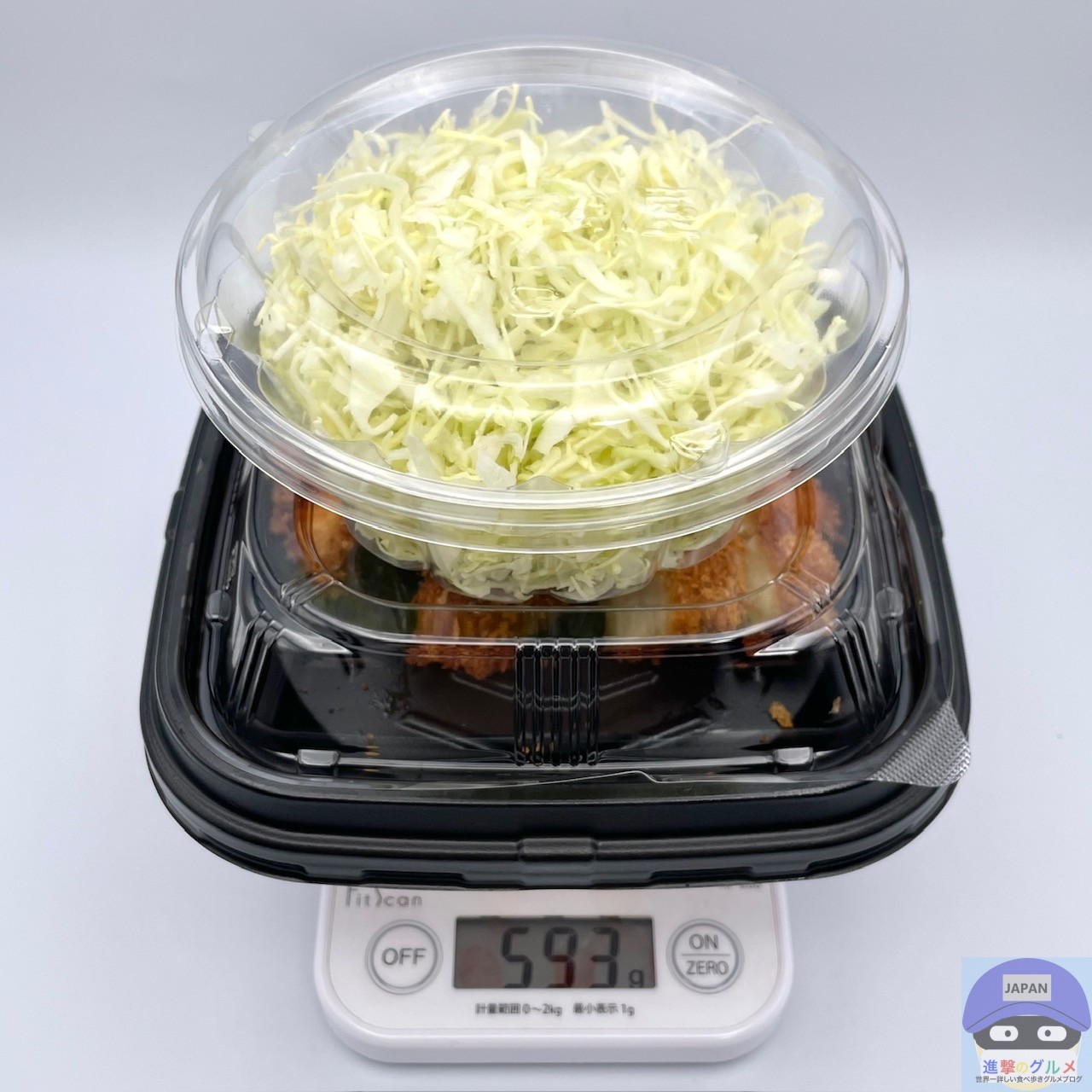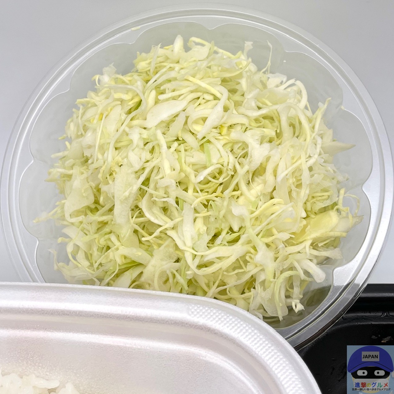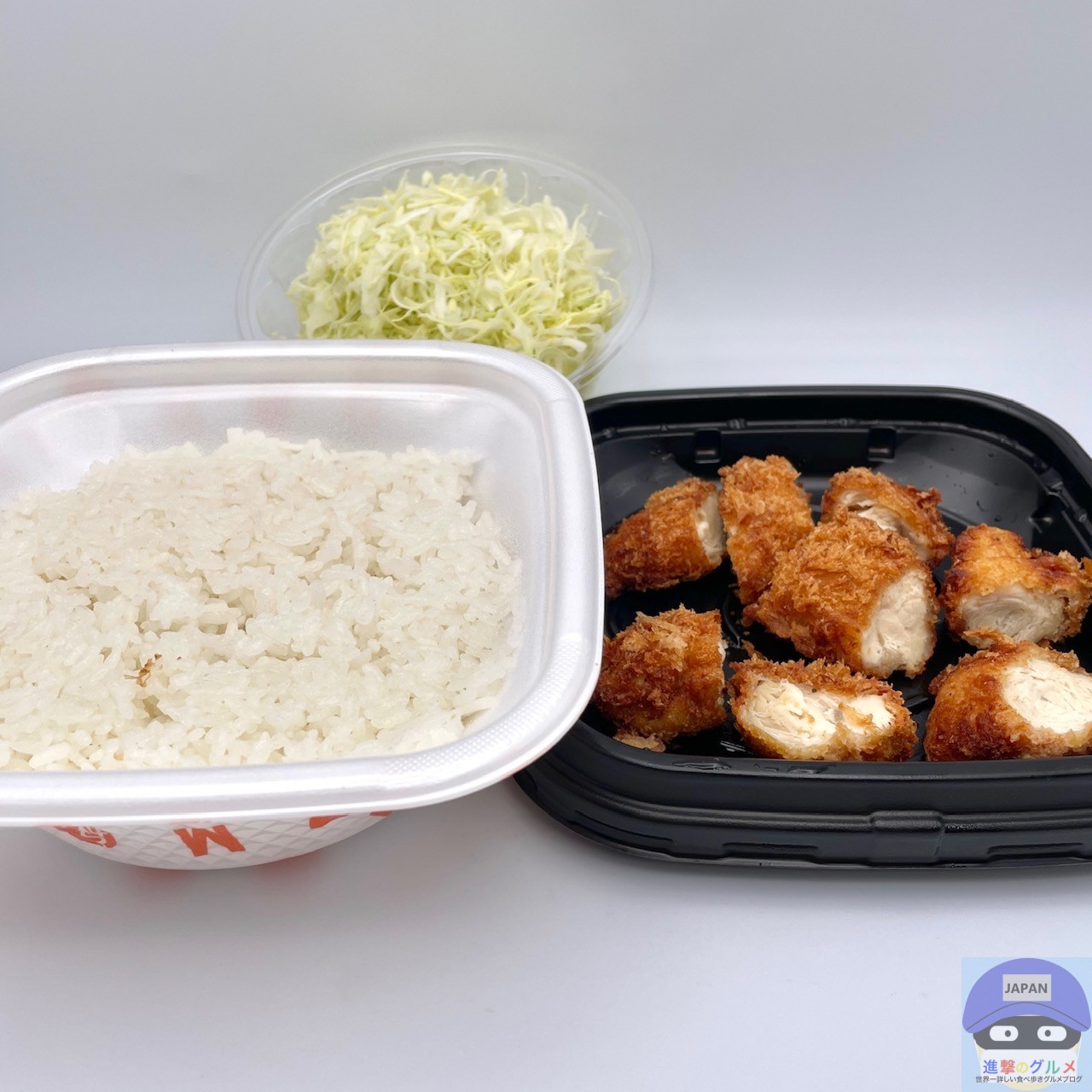 ささみかつ2本(4切れカット×2)、キャベツ、特盛ライスです。
