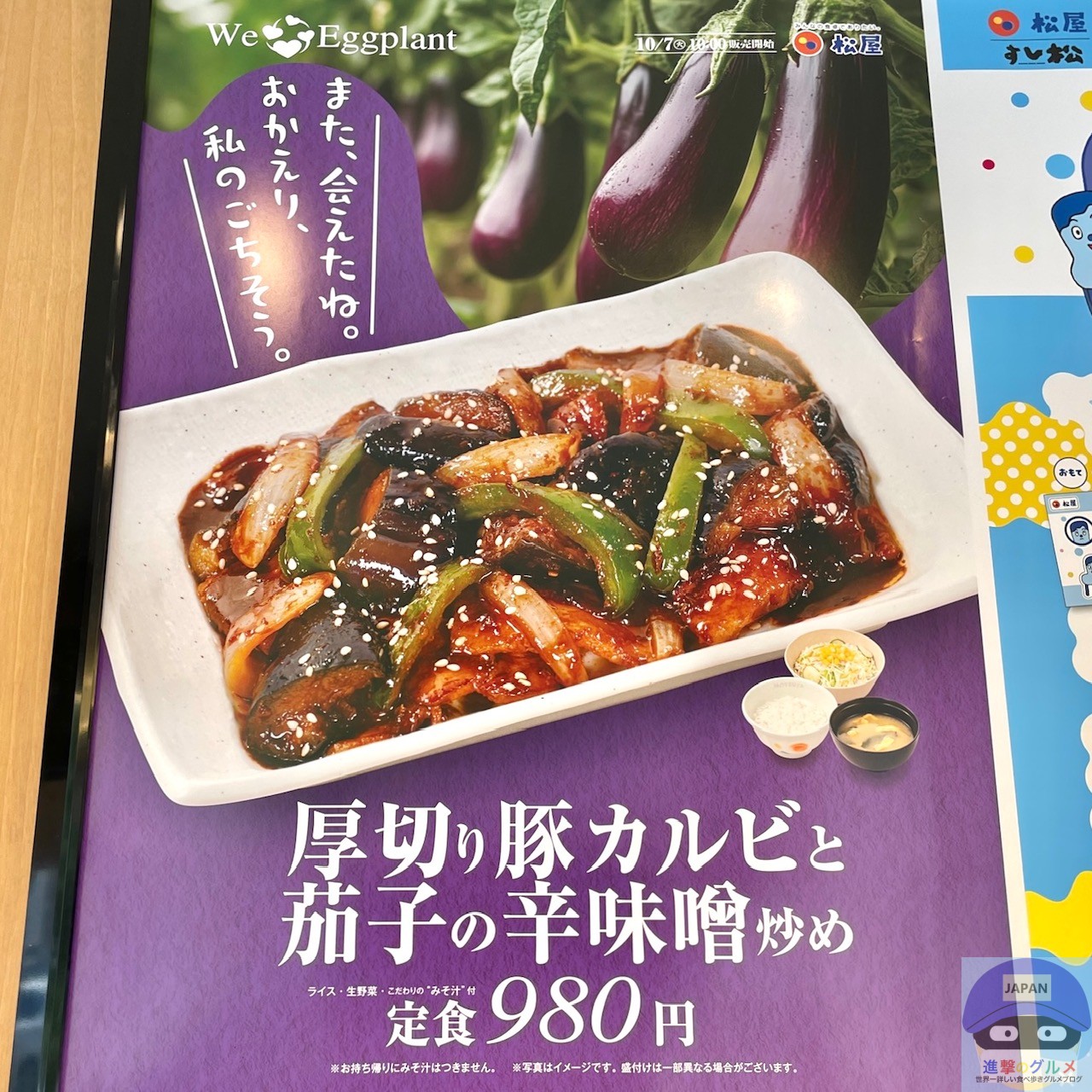 2025年10月7日より、「松屋」が新メニュー「厚切り豚カルビと茄子の辛味噌炒め定食(980円)」を販売開始しました。