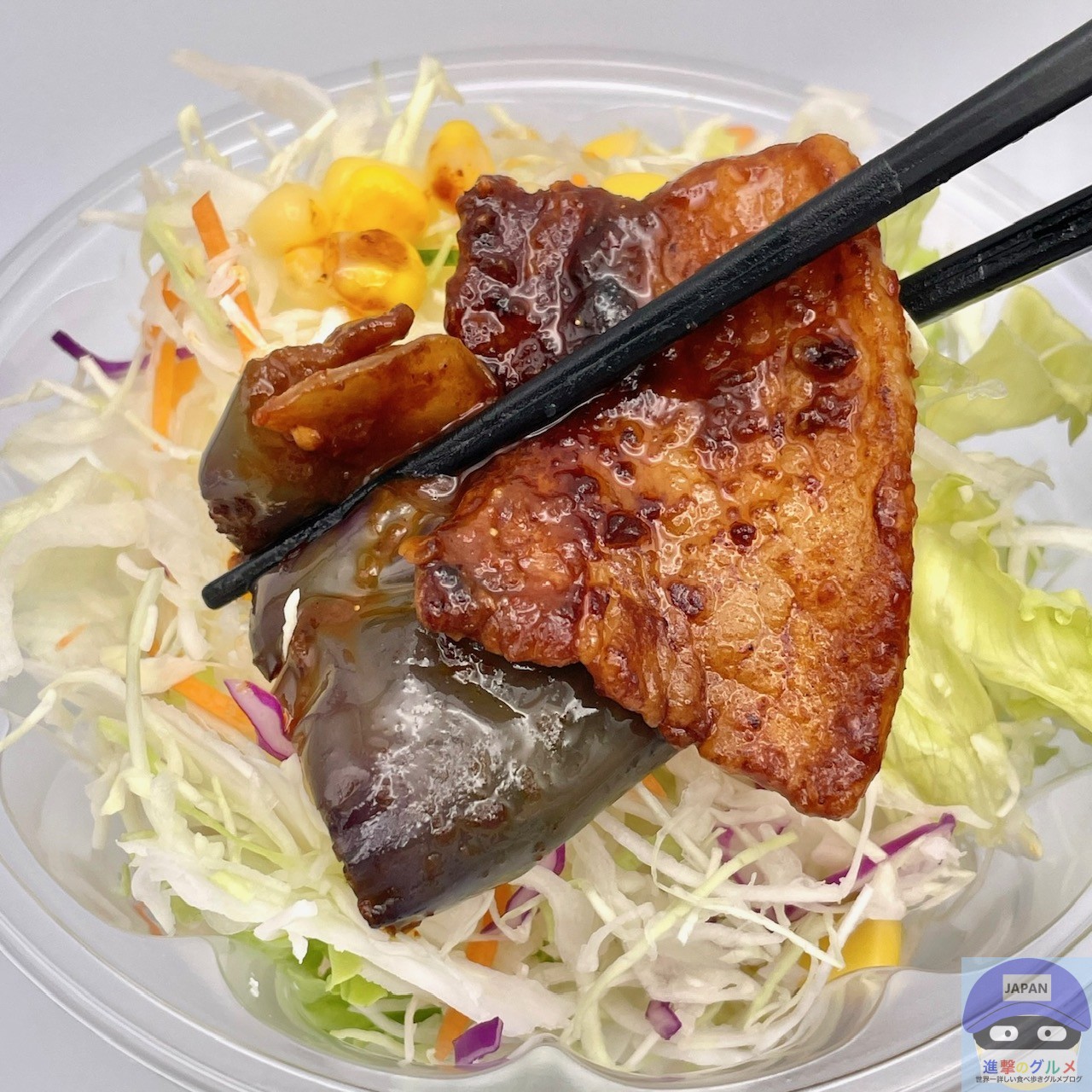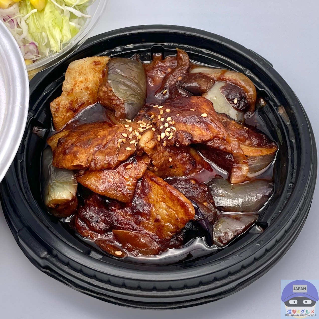 たっぷりの茄子、厚切りの豚カルビ、玉ねぎ、少量のピーマン、辛味噌ダレなどで作られています。
