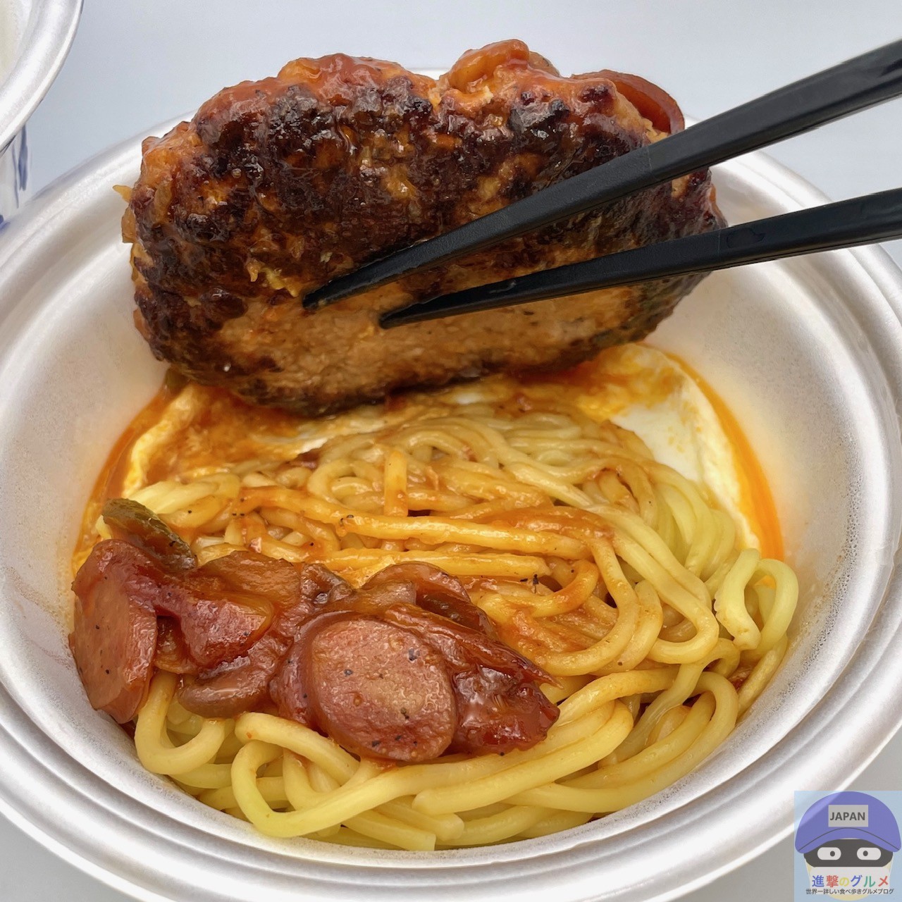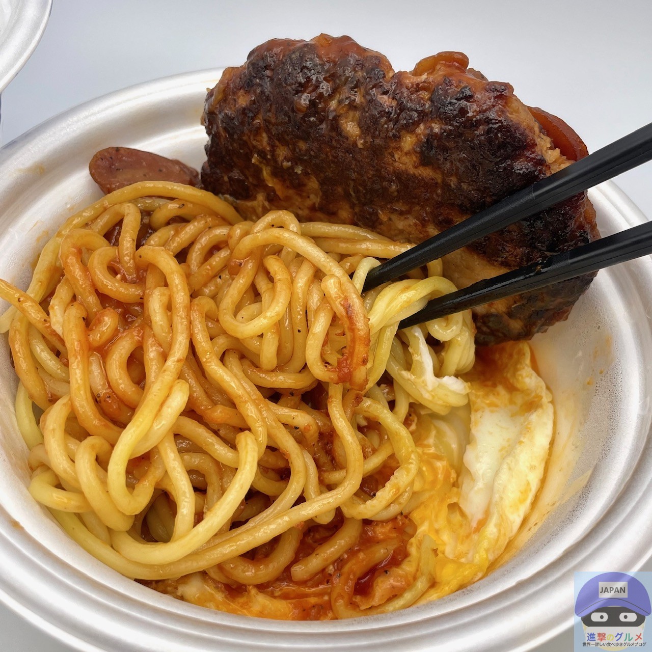 厚みのあるハンバーグと中太麺、玉子焼きに、ケチャップソースがかかっています。