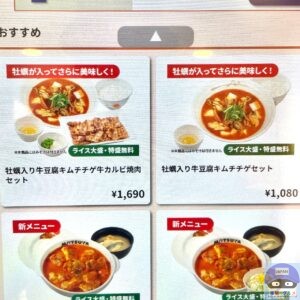 メニューは、「牡蠣入り牛豆腐キムチチゲ牛カルビ焼肉定食(1690円)」、「牡蠣入り牛豆腐キムチチゲセット(1080円)」、「牡蠣入り牛豆腐キムチチゲ・単品(880円)」があります。