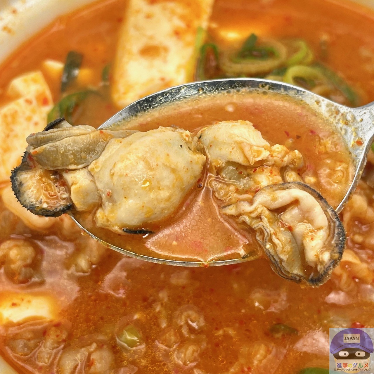 牡蠣の濃い旨味に、熱々でヒリヒリした辛口の辛味、海鮮だしのしっかりした旨味が印象的なチゲスープが食欲を刺激します。