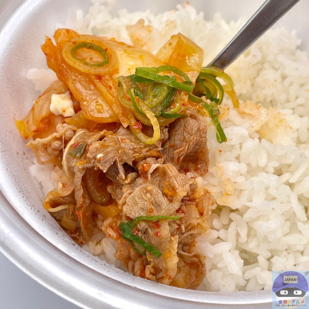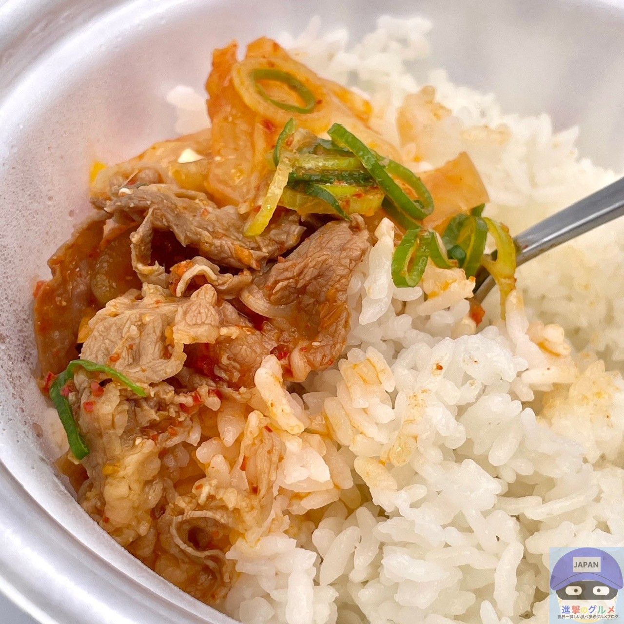 噛みごたえのある牛肉は甘辛く味付けされ、キムチと青ねぎのシャキッと食感がアクセント、ライスがよくすすみます。