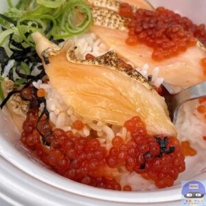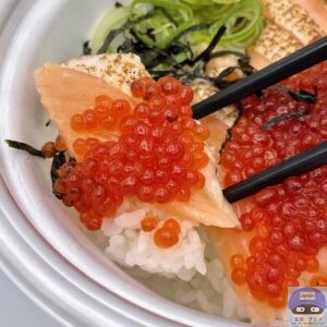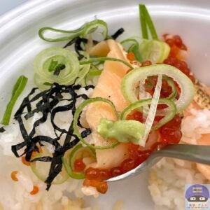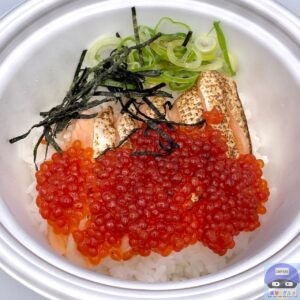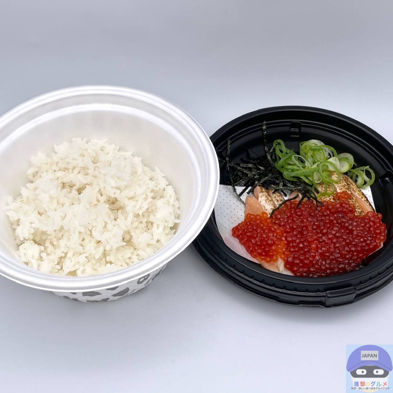 ごはん、いくら、炙りサーモン(6切れ)、青ネギ、刻み海苔の組み合わせです。