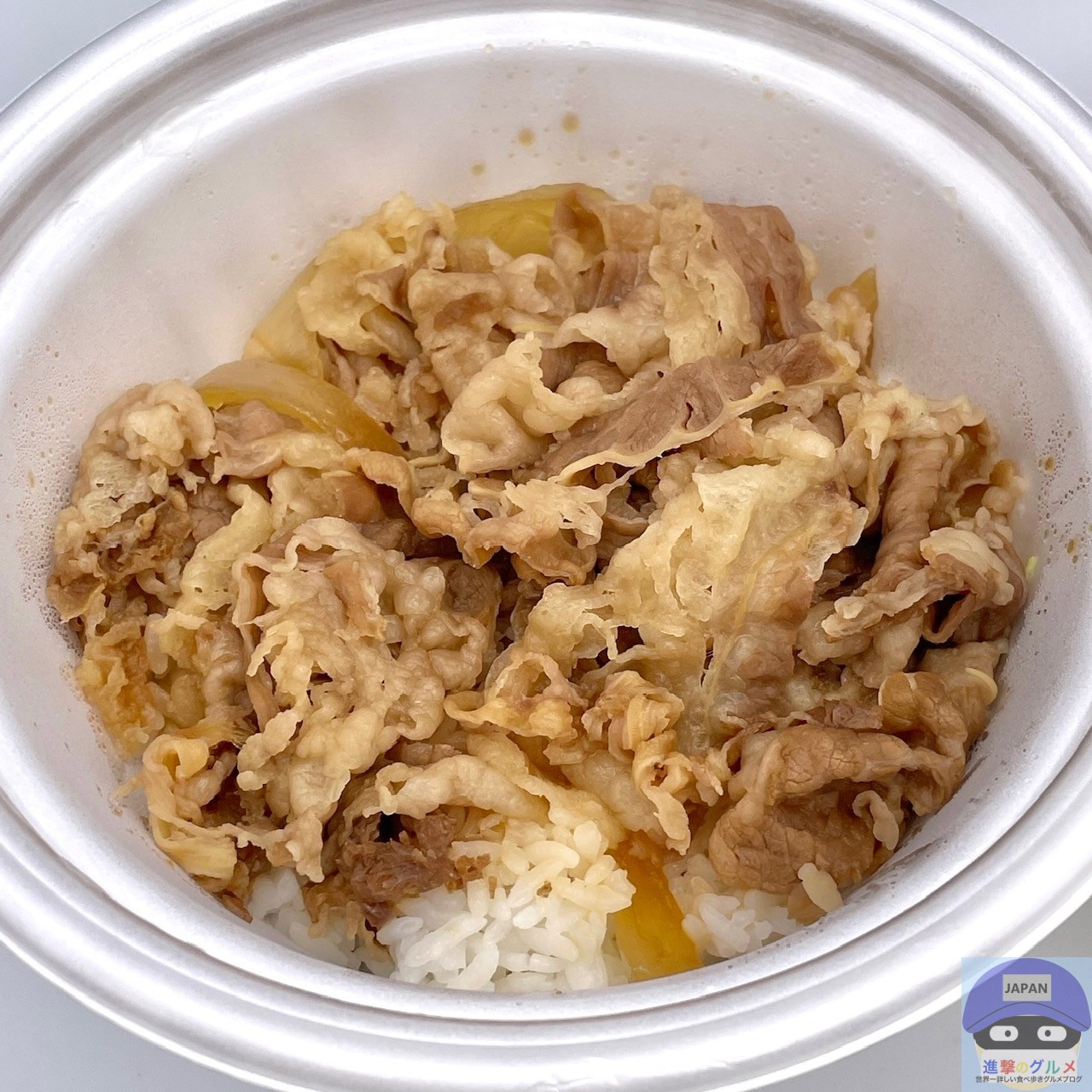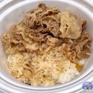 牛めしは、ご飯の上に、秘伝のタレを使用して煮立てた牛肉と玉ねぎがのっています。