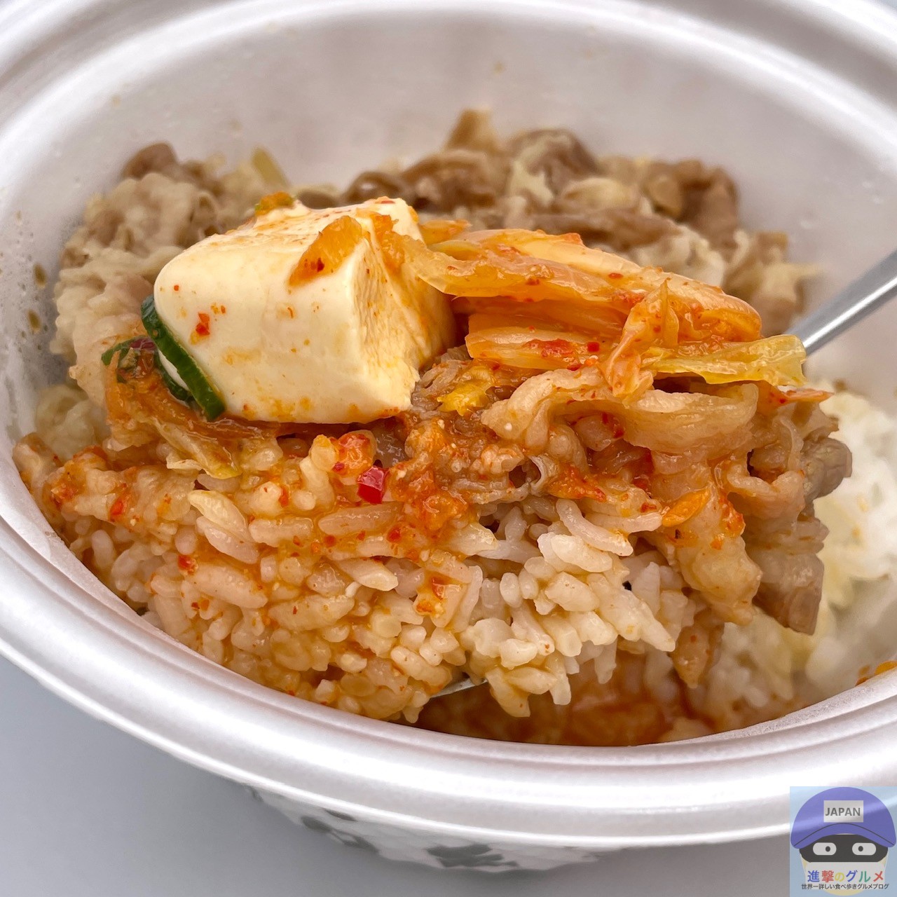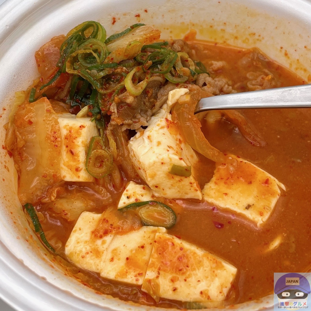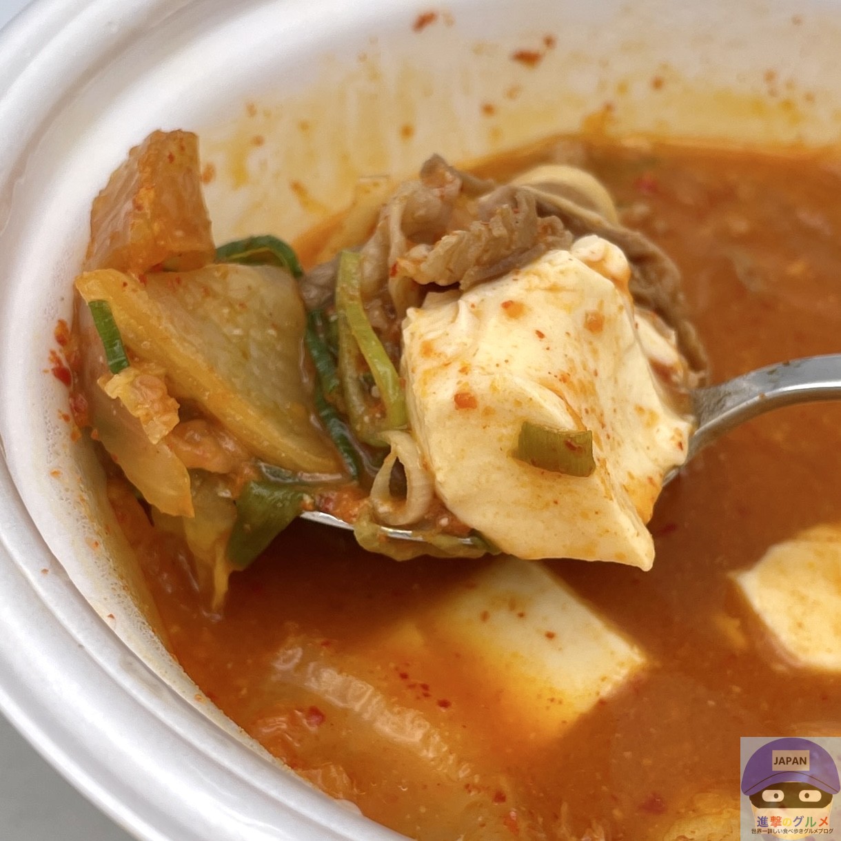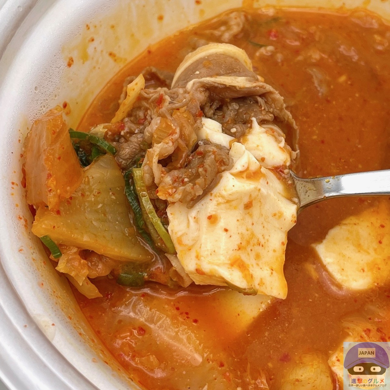 牛肉の旨味に、キムチの辛味と合う甘い玉ねぎ、なめらかな口当たりの豆腐、シャキシャキとした食感の青ねぎが重なり合い、絶妙なバランスを実現しています。