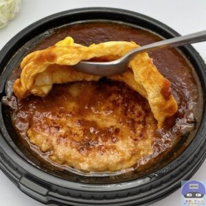 ジューシーに焼き上がったハンバーグに、たっぷりとかけられた艶やかなデミグラスソース、そして玉子を2個使用したふわふわオムレツをのせて提供する逸品です。