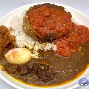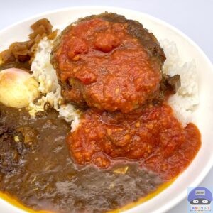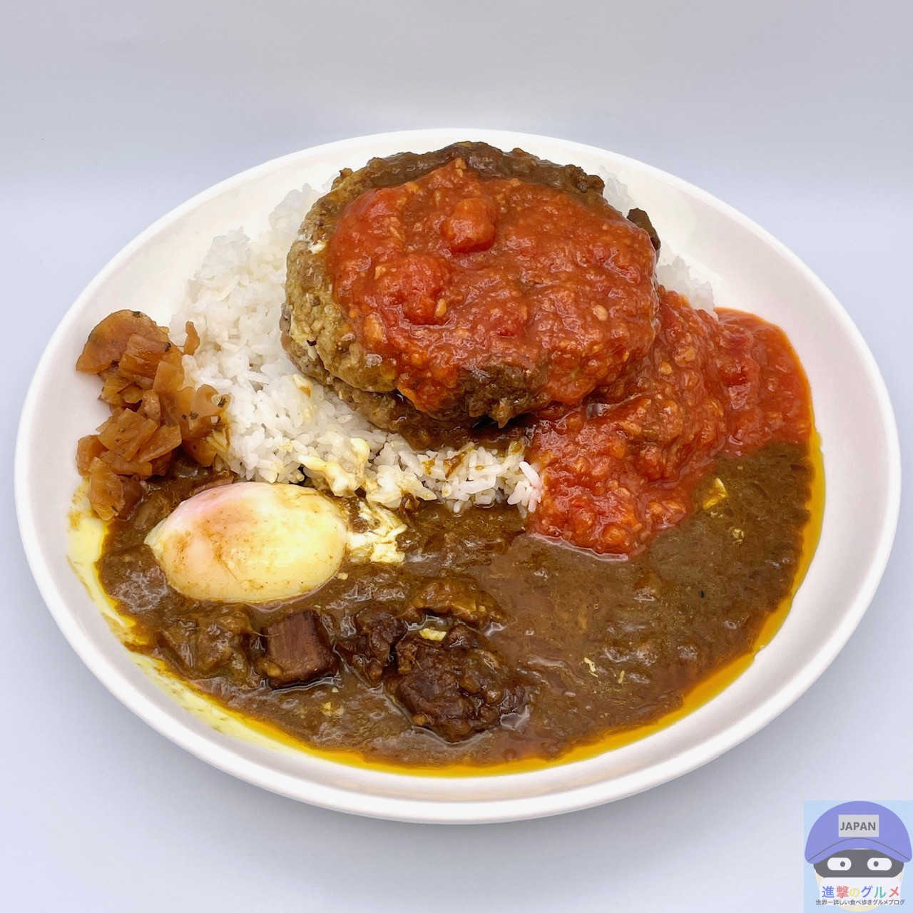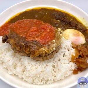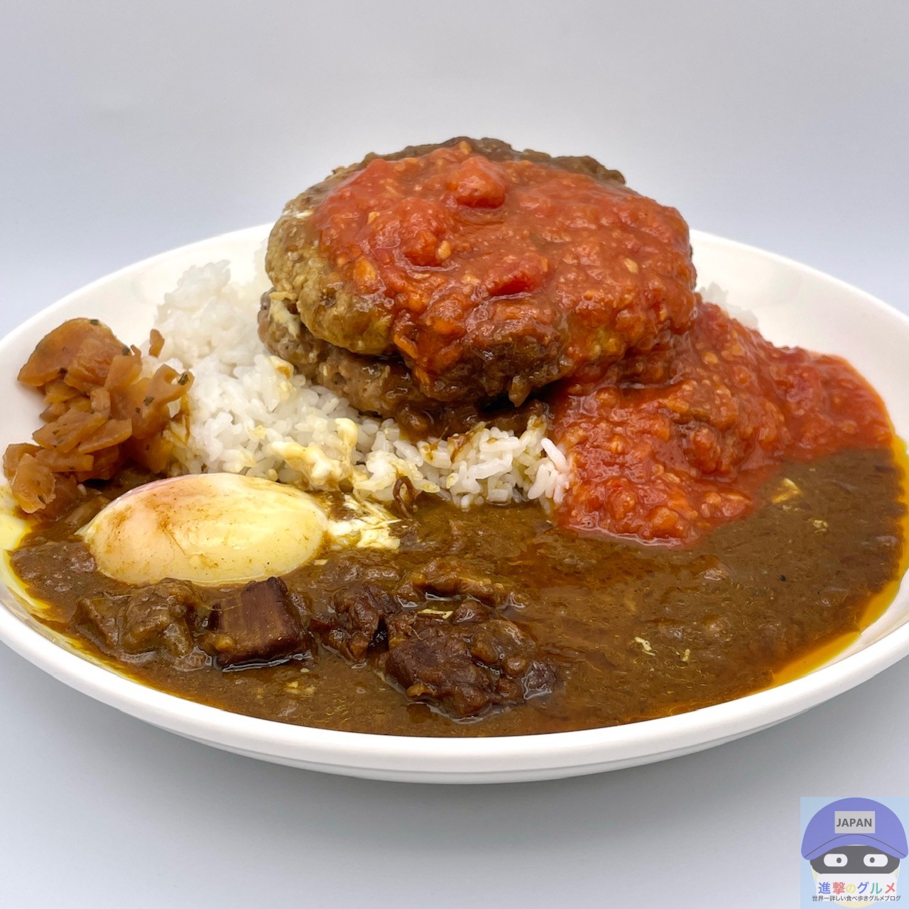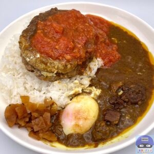 ライス特盛+ハンバーグ創業ビーフカレー+半熟玉子+うまトマソースに、さらにハンバーグを1枚追加しています。