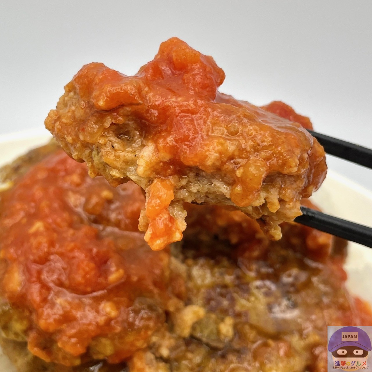粗挽きの部分が肉肉しい程よい柔らかさでややジューシー、味付けされたお肉の旨み、じゅわっとしたうまトマソースのトマトの酸味とにんにくの旨みが食欲を刺激します。